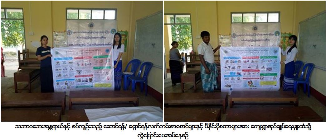 လူမှုဝန်ထမ်း၊ ကယ်ဆယ်ရေးနှင့်ပြန်လည်နေရာချ ထားရေးဝန်ကြီးဌာန၊ ကယ်ဆယ်ရေးနှင့်ပြန် လည်နေရာချထားရေးဦးစီးဌာန၊ ကရင်ပြည်နယ်ဦးစီးမှူးရုံးမှ တာဝန်ရှိသူများသည် (၂၉- ၁၂- ၂၀၁၇)ရက်နေ့တွင် ဘားအံမြို့နယ်၊ တကောင်ဗိုလ်ကျေးရွာ အုပ်စု၊ စိမ်းချောင်းကျေးရွာရှိ စာသင်ကျောင်း၌ကျေးရွာနေ ပြည်သူပေါင်း (၁၅၀)ဦးအား သဘာဝဘေး အန္တရာယ်လျော့ပါးရေး ဆိုင်ရာ အသိပညာပေးဟောပြောပွဲ ကျင်းပပြုလုပ်ခဲ့ရာ တာဝန်ရှိသူများက တက်ရောက်လာသူများ ထံဗလာစာအုပ်နှင့် ဘောလ် ပင်များဖြန့်ဝေပေးခဲ့ပြီး မီးဘေး၊ ရေဘေး၊ မုန်တိုင်းဘေး၊ မိုးကြိုးဘေး၊ ငလျင်ဘေးဆိုင်ရာ ဆောင်ရန်/ ရှောင်ရန်လက်ကမ်း စာစောင်များနှင့် ဗီနိုင်းပိုစတာများကိုလည်း ကျေးရွာ အုပ်ချုပ်ရေးမှူးထံသို့ လွှဲပြောင်းပေးအပ်ခဲ့ကြောင်း သတင်းရရှိပါသည်။