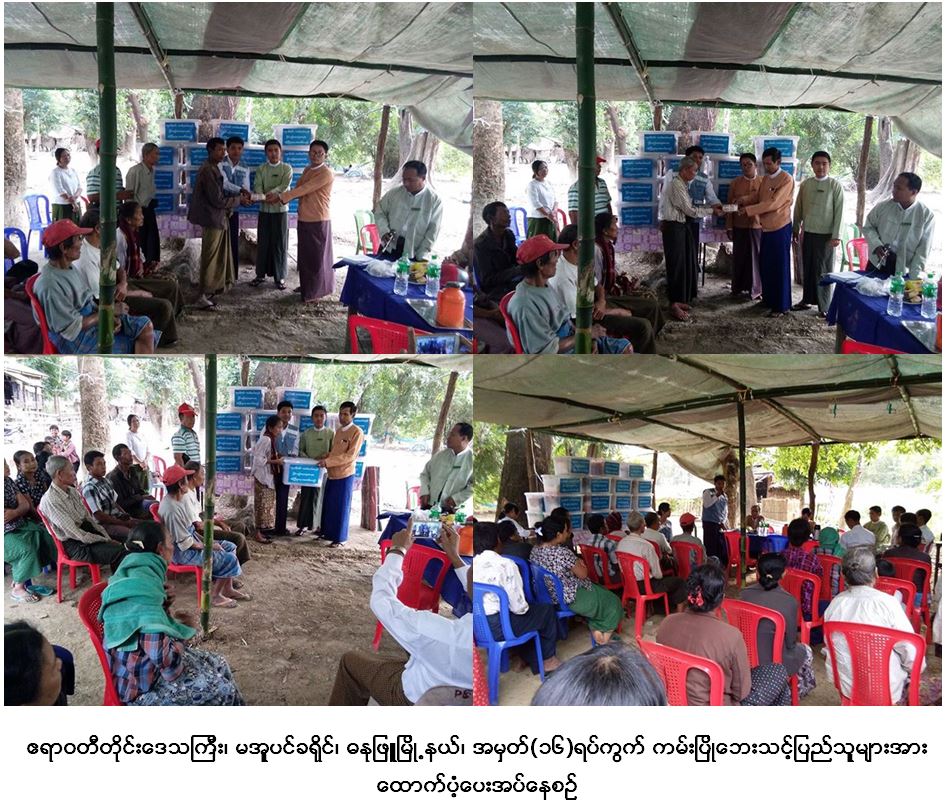 ဧရာဝတီတိုင်းဒေသကြီး၊ မအူပင်ခရိုင်၊ ဓနုဖြူမြို့နယ်၊ အမှတ်(၁၆)ရပ်ကွက်တွင် (၃၀-၁၂-၂၀၁၇) ၊ (၃၁-၁၂-၂၀၁၇) နှင့် (၁-၁-၂၀၁၈)ရက်နေ့တို့၌ ဖြစ်ပွားခဲ့သည့် ကမ်းပြိုဘေးကြောင့် ရေထဲမျောပါပျက်စီးခဲ့သည့် နေအိမ် ၁၁ လုံး၊ ကြိုတင်ရွှေ့ပြောင်းခဲ့သည့် နေအိမ် (၁၅)လုံး စုစုပေါင်း နေအိမ် ၂၆ လုံး အိမ်ထောင်စု ၂၆ စု ဘေးသင့်ခဲ့ရာ မျောပါပျက်စီးခဲ့သည့် နေအိမ် (၁၁)လုံး အိမ်ထောင်စု (၁၁)စုအတွက် ကယ်ဆယ်ရေးပစ္စည်း ၁၆ မျိုး၊ ကြိုတင်ရွှေ့ပြောင်းခဲ့သည့် နေအိမ် (၁၅)လုံး အိမ်ထောင်စု (၁၅)စုအတွက် ကယ်ဆယ်ရေးပစ္စည်း (၁၀)မျိုးနှင့် ကမ်းပြိုဘေးသင့် နေအိမ် (၂၆)လုံးအတွက် အိမ်ဆောက်ပစ္စည်းဖိုး ထောက်ပံ့ငွေ (၂,၆၀၀,၀၀၀/-)ကျပ် အပါအဝင် ဘေးသင့်လူဦးရေ (၈၄)ဦးအတွက် ဆန်ရိက္ခာဖိုး (၇)ရက်စာ ထောက်ပံ့ငွေ (၁၇၆,၄၀၀/-)ကျပ်၊ စုစုပေါင်း ထောက်ပံ့ငွေ (၂,၇၇၆,၄၀၀/-)ကျပ်အား (၂-၁-၂၀၁၈)ရက်နေ့တွင် ကယ်ဆယ်ရေးနှင့် ပြန်လည်နေရာချထားရေးဦးစီးဌာန၊ မအူပင်ခရိုင်ဦးစီးမှူးရုံးမှ တာဝန်ရှိသူများသည် ဓနုဖြူမြို့နယ် ပြည်သူ့လွှတ်တော်ကိုယ်စားလှယ် ဦးတင်လှ၊ တိုင်းဒေသကြီး (၁) လွှတ်တော်ကိုယ်စားလှယ် ဦးအောင်နိုင်ထွန်း၊ တိုင်းဒေသကြီး (၂) လွှတ်တော်ကိုယ်စားလှယ် ဦးဆန်းထွေး၊ ဓနုဖြူမြိုနယ်အုပ်ချုပ်ရေးမှူး ဒုတိယမြို့နယ်အုပ်ချုပ်ရေးမှူး မြို့နယ်စီမံကိန်းရေးဆွဲရေးကော်မတီမှ ဦးကျော်စိုး၊ ဦးကျော်မင်းတို့နှင့်အတူ ဘေးသင့်ပြည်သူများထံသို့ သွားရောက်ထောက်ပံ့ပေးအပ်ခဲ့ကြောင်း သတင်းရရှိပါသည်။