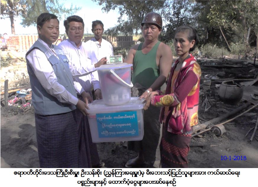 လူမှုဝန်ထမ်း၊ ကယ်ဆယ်ရေးနှင့်ပြန်လည်နေရာချထားရေးဝန်ကြီးဌာန၊ ကယ်ဆယ်ရေးနှင့်ပြန်လည်နေရာချထားရေးဦးစီးဌာန၊ ဧရာဝတီတိုင်းဒေသကြီးဦးစီးမှူးရုံးမှ တာဝန်ရှိသူများသည် (၉-၁-၂၀၁၈)ရက်နေ့၌ ဧရာဝတီတိုင်းဒေသကြီး၊ ပုသိမ်ခရိုင်၊ ပုသိမ်မြို့နယ်၊ အမှတ်(၁၂)ရပ်ကွက်၊ ကြက်ခတ်ကုန်းကျေးရွာ၌ ဖြစ်ပွားခဲ့သော မီးဘေးကြောင့် မီးလောင်ကျွမ်းပျက်စီးခဲ့သည့် ဓနိမိုး၊ ထရံကာ၊ ဝါးအိမ်(၂)လုံး၊ အိမ်ထောင်စု(၂)စုမှ လူဦးရေ(၁၃)ဦးအတွက် Family Kits (၂၆)မျိုးပါ (၂)ပုံး၊ ပလပ်စတစ်ပုံး(၂)ပုံး၊ ဆန်ရိက္ခာ(၇)ရက်စာ (၂၇၃၀၀ိ/-)၊ အိမ်ဆောက်ပစ္စည်းဖိုးရန်ပုံငွေ(၂၀၀၀၀၀ိ/-)၊ စုစုပေါင်း ရန်ပုံငွေ (၂၂၇၃၀၀ိ/-)အား (၁၀-၁-၂၀၁၈)ရက်နေ့တွင် ဧရာဝတီတိုင်းဒေသကြီးဦးစီးမှူး ဦးသန်းစိုး (ညွှန်ကြားရေးမှူး)နှင့် တာဝန်ရှိသူများမှ မီးဘေးသင့်ပြည်သူများ၏ လက်ဝယ်အရောက် ကွင်းဆင်းထောက်ပံ့ပေးအပ်ခဲ့ကြောင်း သတင်းရရှိပါသည်။