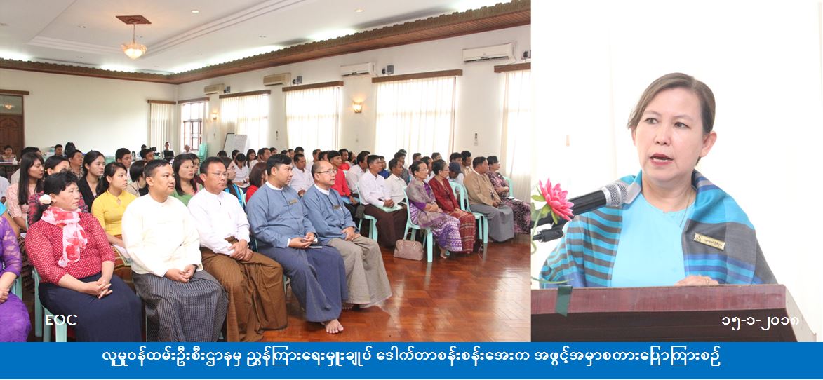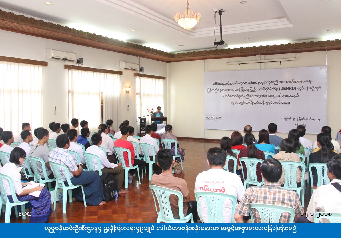 ရခိုင်ပြည်နယ်အတွင်း လူသားချင်းစာနာမှု အကူအညီအထောက်အပံ့ပေးရေး၊ ပြန်လည်နေရာချထားရေး၊ ဖွံ့ဖြိုးရေး ပြည်ထောင်စုစီမံကိန်း(Union Enterprise for Humanitarian Assistance, Resettlement and Development in Rakhine- UEHRD)၏ စေတနာ့၀န်ထမ်း လူငယ်အစီအစဥ်(စတုတ္ထအဖွဲ့)တွင် ပါ၀င်ကြမည့် စေတနာ့၀န်ထမ်းလူငယ်များအတွက် လုပ်ငန်းခွင်အကြိုသင်တန်းအား (၁၄-၁-၂၀၁၈)နေ့ နံနက်ပိုင်းတွင် ရန်ကုန်မြို့၊ သံလွင်လမ်းရှိ လူမှု၀န်ထမ်းဦးစီးဌာန၊ အမျိုးသမီးများဖွံ့ဖြိုးတိုးတက်ရေးဌာန၌ ကျင်းပပြုလုပ်ခဲ့ပါသည်။ အဆိုပါ လူငယ်ထုပါ၀င်သည့် စေတနာ့၀န်ထမ်းလူငယ်အစီအစဥ်၏ ပထမအကြိမ်သင်တန်းကို (၅-၁၁-၂၀၁၇)နေ့မှ (၂၄-၁၁-၂၀၁၇)နေ့အထိလည်းကောင်း၊ ဒုတိယအကြိမ်သင်တန်းကို(၂၄-၁၁-၂၀၁၇) နေ့မှ (၁၃-၁၂-၂၀၁၇)နေ့အထိလည်းကောင်း၊ တတိယအကြိမ်သင်တန်းကို (၁၆-၁၂-၂၀၁၇)နေ့မှ (၄-၁-၂၀၁၈)နေ့အထိလည်းကောင်း အောင်မြင်စွာဆောင်ရွက််ခဲ့ပါသည်။