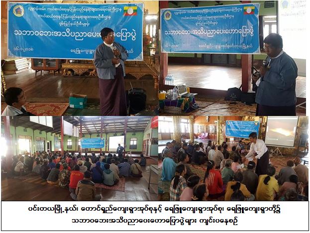 လူမှုဝန်ထမ်း၊ ကယ်ဆယ်ရေးနှင့် ပြန်လည်နေရာချထားရေးဝန်ကြီးဌာန၊ ကယ်ဆယ်ရေးနှင့် ပြန်လည်နေရာချထားရေးဦးစီးဌာန ရှမ်းပြည်နယ်ဦးစီးမှူးရုံးမှတာဝန်ရှိသူများသည် (၁၆-၁-၂၀၁၈)ရက်နေ့ နံနက်ပိုင်းတွင် ပင်းတယမြို့နယ်၊ တောင်ရှည်ကျေးရွာအုပ်စု၊ ရွှေကြာအင်းကန်ဘုန်းတော်ကြီးကျောင်း၌ သဘာဝဘေးအန္တရာယ်ဆိုင်ရာ အသိပညာပေးဟောပြောပွဲ ကျင်းပပြုလုပ်ခဲ့ရာ ကျေးရွာလူထု (၂၁၀)ဦးခန့် တက်ရောက်ခဲ့ပါကြောင်း၊ (၁၆-၁-၂၀၁၈)ရက်နေ့ နေ့လည်ပိုင်းတွင် ရေဖြူကျေးရွာအုပ်စု၊ ရေဖြူကျေးရွာရှိ ဘုန်းတော်ကြီးကျောင်း၌လည်းကောင်း သဘာဝဘေးအန္တရာယ်ဆိုင်ရာ အသိပညာပေးဟောပြောပွဲ ကျင်းပပြုလုပ်ခဲ့ရာ ကျေးရွာလူထု (၁၇၀)ဦးခန့်တက်ရောက်ခဲ့ပါကြောင်းနှင့် သဘာဝဘေးအန္တရာယ်ဆိုင်ရာ အသိပညာပေးဟောပြောပွဲများတွင် လေပြင်းဘေး၊ မိုးကြိုးဘေးနှင့် ငလျင်ဘေးအန္တရာယ်ဆိုင်ရာများအား ေဟာပြောခဲ့ပြီး မှတ်တမ်းဗွီဒီယိုများပြသခြင်းနှင့် လက်ကမ်းစာစောင်ဝေငှခြင်းများ ဆောင်ရွက်ခဲ့ပါကြောင်း သတင်းရရှိပါသည်။