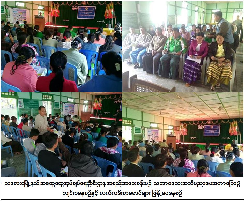 ကလေးခရိုင်ဦးစီးမှူးရုံးမှ တာဝန်ရှိသူများသည် (၁၉-၁-၂၀၁၈) ရက်နေ့ နံနက်(၀၉:ဝဝ)နာရီမှ(၁၀:၃၀)နာရီထိ ကလေးဝမြို့နယ် အထွေထွေအုပ်ချုပ်ရေးဦးစီးဌာန အစည်းအဝေးခန်းမ၌ မြို့နယ်အဆင့်ဌာနဆိုင်ရာများ၊ လူမှုရေးအဖွဲ့အစည်းများနှင့် နိုင်ငံရေးအဖွဲ့အစည်းများအား သဘာဝဘေးအန္တရာယ်အကြောင်း အသိပညာပေး ဟောပြောဆွေးနွေးခဲ့ရာ ဟောပြောပွဲသို့ လူဦးရေ (၁၀၀)ကျော် တက်ရောက်ခဲ့ပြီး လက်ကမ်းစာစောင်များအား ဖြန့်ဝေပေးခဲ့ကြောင်း သတင်းရရှိပါသည်။