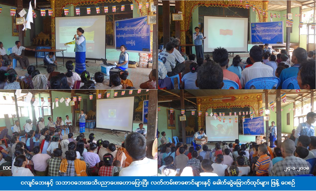 ကယ်ဆယ်ရေးနှင့် ပြန်လည်နေရာချထားရေးဦးစီးဌာန၊ မကွေးတိုင်းဒေသကြီးဦးစီးမှူးရုံးမှ တာဝန်ရှိသူများသည် (၂၃-၁-၂၀၁၈) ရက်နေ့တွင် မကွေးမြို့နယ်၊ ကန်သစ်ကျေးရွာ၌ ငလျင်ဘေးနှင့်သဘာဝဘေးအသိပညာပေး ဟောပြောပွဲပြုလုပ်ခဲ့ပြီး လက်ကမ်းစာစောင်များနှင့် ခေါက်ဆွဲခြောက်များ ဝေငှခဲ့ပါသည်။ ဟောပြောပွဲသို့ ကျေးရွာသူ/ကျေးရွာသား (၁၀၀) ဦးတက်ရောက်ခဲ့ကြောင်း သိရှိရပါသည်။