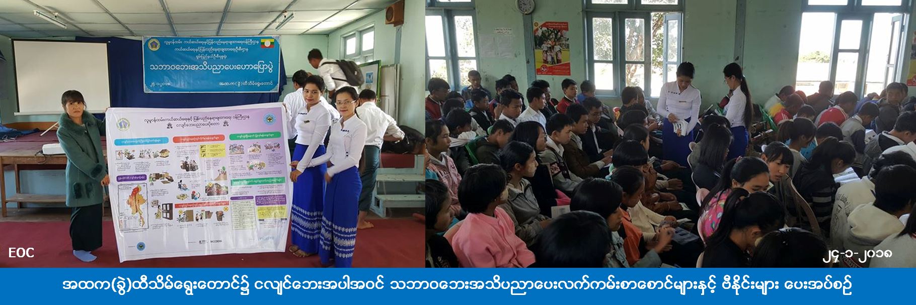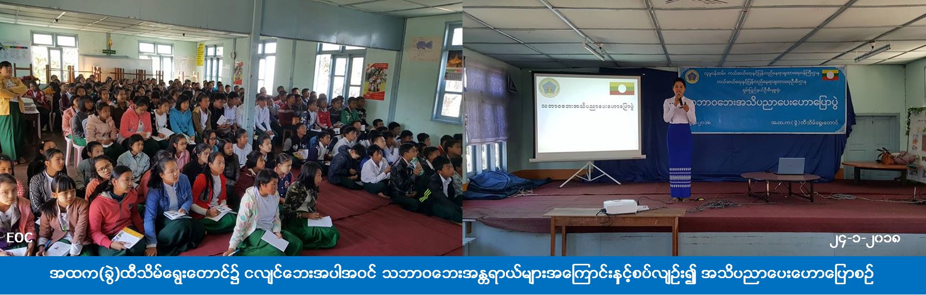 ကယ်ဆယ်ရေးနှင့် ပြန်လည်နေရာချထားရေးဦးစီးဌာန၊ ရှမ်းပြည်နယ်ဦးစီးမှူးရုံးမှ တာဝန်ရှိသူများသည် (၂၄-၁-၂၀၁၈) ရက်နေ့ နံနက်ပိုင်းတွင် တောင်ကြီးမြို့နယ် အထက(ခွဲ)ထီသိမ်ရွေးတောင်၌ ဆရာ/ဆရာမနှင့် ကျောင်းသား/သူ (၃၀၀) ဦးခန့်အား လည်းကောင်း၊ ညနေပိုင်းတွင် တောင်ကြီးမြို့နယ် အထက(ခွဲ)ထီသိမ်၌ ဆရာ/ဆရာမနှင့် ကျောင်းသား/ကျောင်းသူ (၃၅၀) ဦးခန့်အားလည်းကောင်း ငလျင်ဘေးအပါအဝင် သဘာဝဘေးအန္တရာယ်များအကြောင်းနှင့်စပ်လျဉ်း၍ ရှင်းလင်းပြောကြားခြင်းနှင့် အသိပညာပေး ဗွီဒီယိုပြသခြင်းတို့အား ဆောင်ရွက်ခဲ့ကြောင်း သိရှိရပါသည်။