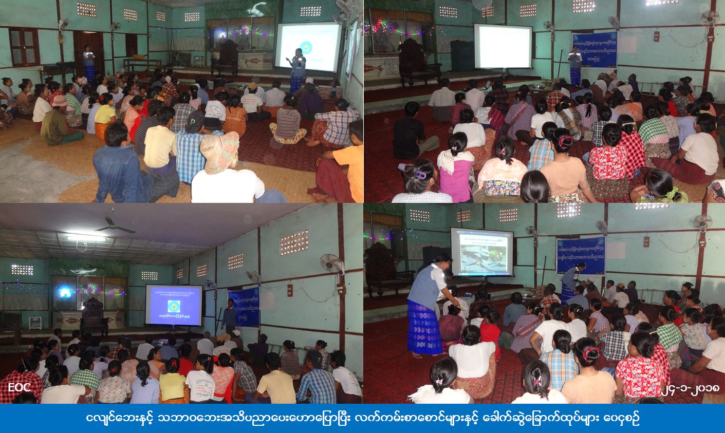 ကယ်ဆယ်ရေးနှင့် ပြန်လည်နေရာချထားရေးဦးစီးဌာန၊ မကွေးတိုင်းဒေသကြီးဦးစီးမှူးရုံးမှ တာဝန်ရှိသူများသည် (၂၄-၁-၂၀၁၈) ရက်နေ့တွင် မကွေးမြို့နယ်၊ ဆားတိုင်ကန်ကျေးရွာ၌ ငလျင်ဘေးနှင့် သဘာဝဘေးအသိပညာပေး ဟောပြောပွဲပြုလုပ်ခဲ့ပြီး လက်ကမ်းစာစောင်များနှင့် ခေါက်ဆွဲခြောက်ထုပ်များ ဝေငှပေးခဲ့ပါသည်။ ဟောပြောပွဲသို့ကျေးရွာသူ၊ ကျေးရွာသား (၈၀) ဦးတက်ရောက်ခဲ့ကြောင်း သိရှိရပါသည်။
