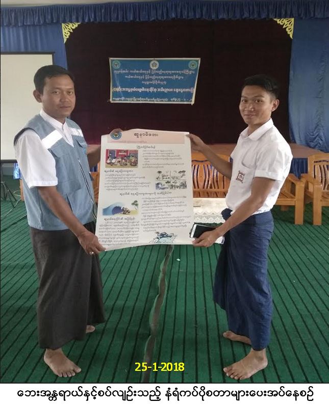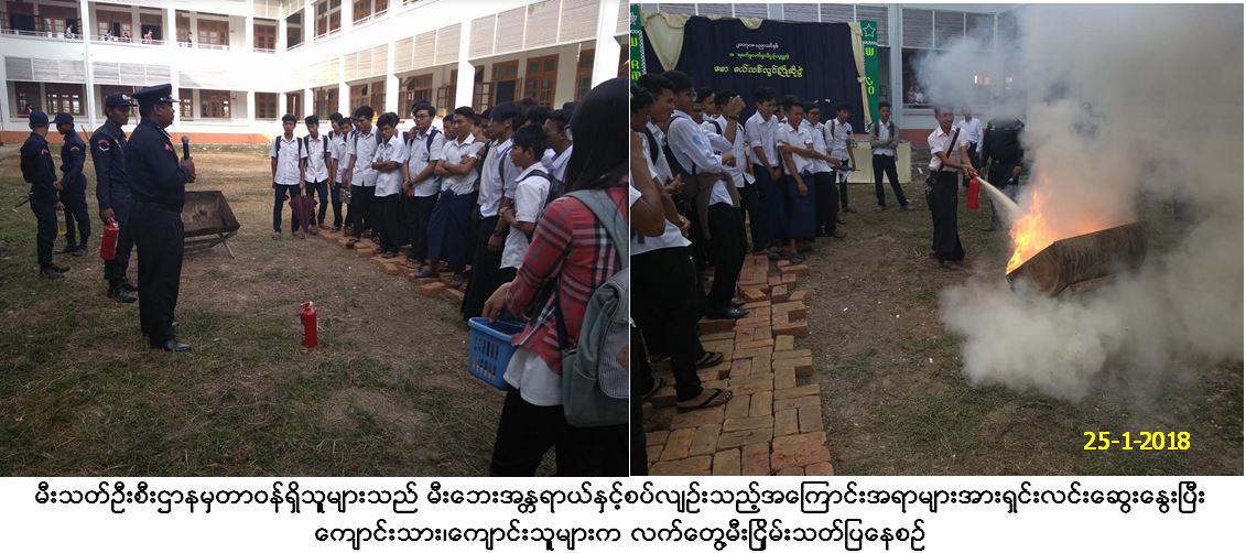 လူမှုဝန်ထမ်း၊ ကယ်ဆယ်ရေးနှင့် ပြန်လည်နေရာချထားရေးဝန်ကြီးဌာန၊ ကယ်ဆယ်ရေးနှင့်ပြန်လည်နေရာချထားရေးဦးစီးဌာန၊ လပွတ္တာခရိုင်ဦးစီးမှူးရုံးမှ တာဝန်ရှိသူများသည် မီးသတ်ဦးစီးဌာနမှတာဝန်ရှိသူများနှင့်ပူးပေါင်း၍ (၂၅-၁-၂၀၁၈)ရက်နေ့တွင် လပွတ္တာ၊ (၃)မိုင်မြို့သစ်ရှိ အစိုးရစက်မှုလက်မှုသိပ္ပံကျောင်း၌ နည်းပညာကျောင်းသား၊ ကျောင်းသူ (၂၀၀)ဦးခန့်အား ငလျင်ဘေးအန္တရာယ်အသိပညာပေးဟောပြောဆွေးနွေးခဲ့ပြီး လက်ကမ်းစာစောင်များ၊ နံရံကပ်ပိုစတာများ ဝေငှခြင်းတို့ ဆောင်ရွက်ခဲ့ကြောင်း သတင်းရရှိပါ သည်။