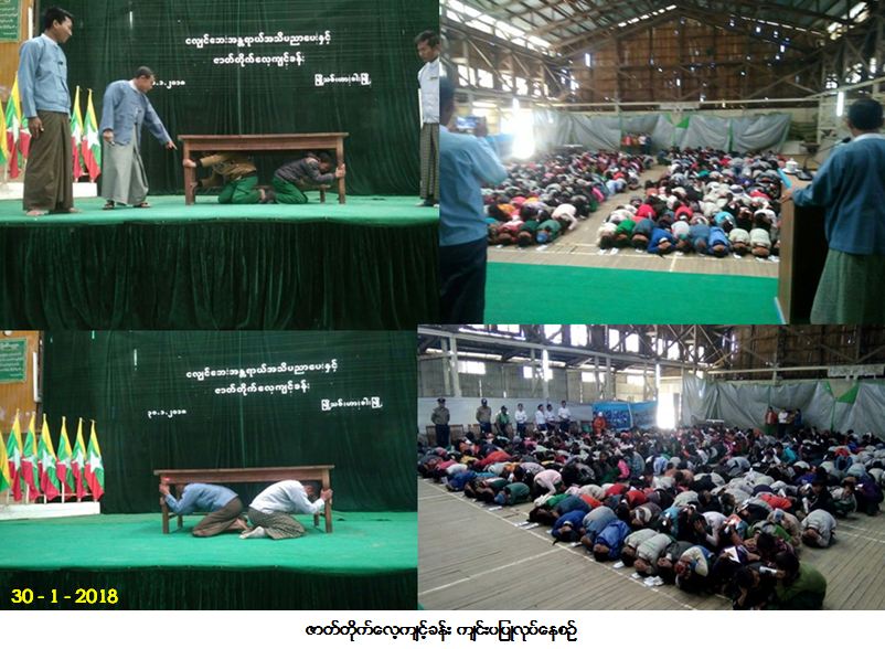 ကယ်ဆယ်ရေးနှင့် ပြန်လည်နေရာချထားရေးဦးစီးဌာန၊ ချင်းပြည်နယ်ဦးစီးမှူးရုံးမှ တာဝန်ရှိသူများသည် (၃၀-၁-၂၀၁၈) ရက်နေ့တွင် ဟားခါးမြို့၊ မြို့သစ်ရပ်ကွက်၊ ဗိုလ်ကြွှမ်ဘိ ခန်းမတွင် ငလျင်ဘေးအန္တရာယ်ဆိုင်ရာ အသိပညာပေးဟောပြောပွဲနှင့် ဇာတ်တိုက်လေ့ကျင့်ခန်းအား ကျင်းပပြုလုပ်ခဲ့ရာ ဌာနဆိုင်ရာများ၊ မီးသတ် ဦးစီးဌာန၊ မြန်မာနိုင်ငံ ကြက်ခြေနီအသင်း၊ ဆရာ/ဆရာမများ၊ ကျောင်းသား/ကျောင်းသူများနှင့် ပြည်သူလူထု များ စုစုပေါင်း (၄၀၀) ကျော် တက်ရောက်ခဲ့ကြောင်း သတင်းရရှိပါသည်။