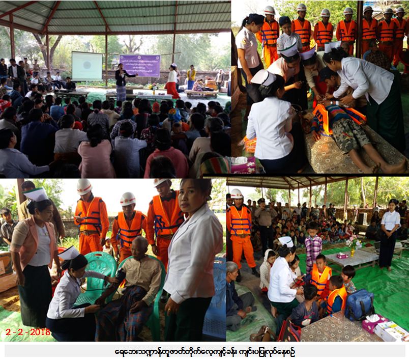 ဘေးအန္တရာယ်ဆိုင်ရာစီမံခန့်ခွဲမှုဦးစီးဌာန၊ မြောက်ဦးခရိုင်ဦးစီးမှူးရုံးမှ တာဝန်ရှိသူများသည် မီးသတ်ဦးစီးဌာန၊ မိုးလေဝသနှင့်ဇလဗေဒညွှန်ကြားမှုဦးစီးဌာန၊ကျန်းမာရေးဦးစီးဌာန၊ မြန်မာနိုင်ငံကြက်ခြေနီတပ်ဖွဲ့နှင့် ပူးပေါင်း၍ (၂-၂-၂၀၁၈) ရက်နေ့ နံနက် (၀၉း၀၀)အချိန်မှ (၁၂း၀၀)နာရီအချိန်ထိ မြောက်ဦးမြို့နယ် ၊ ကလကကျေးရွာ တွင် ရေဘေးသဏ္ဍာန်တူ ဇာတ်တိုက်လေ့ကျင့်ခန်းအား ကျေးရွာနေပြည်သူ(၃၀၀)ဦးဖြင့် ပြုလုပ်ခဲ့ပြီး ဇာတ်တိုက်လေ့ကျင့်ခန်းဆောင်ရွက်ရသည့် ရည်ရွယ်ချက်နှင့် ရေဘေးအန္တရာယ်နှင့်ပတ်သက်သည့် ဆောင်ရန်/ရှောင်ရန်များကို ရှင်းလင်းပြောကြားခြင်း၊ ရေနစ်သူအား ကယ်ဆယ်နည်းနှင့် ရှေးဦးပြုစုနည်းတို့ကို လက်တွေ့သရုပ်ပြသခြင်းများဆောင်ရွက်ခဲ့ပါကြောင်း သတင်းရရှိပါသည်။