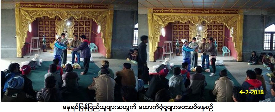 ဘေးအန္တရာယ်ဆိုင်ရာစီမံခန့်ခွဲမှုဦးစီးဌာန၊ ကချင်ပြည်နယ်ဦးစီးမှူးရုံးမှ တာဝန်ရှိသူများသည် ကချင်ပြည်နယ်၊ တနိုင်းမြို့နယ်ရှိ ပယင်းမှော်လုပ်ကွက်များမှ မိုးကောင်းမြို့သို့ (၃-၂-၂၀၁၈) ရက်နေ့၊ ည (၂၂:၅၀)နာရီအချိန်တွင် ရောက်ရှိလာသော နေရပ်ပြန်ပြည်သူ (၄၃) ဦးအတွက် မိုးကောင်းမြို့သာသာနာ့ဗိမာန်၌ တီရှပ် (၁)ထည်၊ တဘက်(၁)ထည်၊ ဆပ်ပြာ (၁)တောင့်၊ ဆန်ရိက္ခာ (၇) ရက်စာ (၂၁၀၀)ကျပ်နှင့် ရထားလက်မှတ်ခ စုစုပေါင်း (၅၆၇၀၀/-)ကျပ်တို့အား (၄-၂-၂၀၁၈) ရက်နေ့တွင် သွားရောက်ထောက်ပံ့ပေးအပ် ခဲ့ကြောင်း သတင်းရရှိပါသည်။