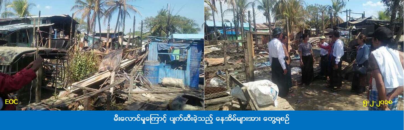 ရန်ကုန်တိုင်းဒေသကြီး၊ ဒလမြို့နယ်၊ ကျန်စစ်သားရပ်ကွက်၊ ရာဇသင်္ကြန်လမ်း၌ (၄-၂-၂၀၁၈) ရက်နေ့တွင် မီးလောင်မှုကြောင့် လုံးဝပျက်စီးခဲ့သည့် အိမ်ခြေ(၄)လုံးနှင့် တစ်စိတ်တစ်ပိုင်းပျက်စီးခဲ့သည့် အိမ်ခြေ(၂)လုံးတို့မှ စုစုပေါင်းအိမ်ထောင်စု(၈)စု၊ စုစုပေါင်းလူဦးရေ(၄၄)ဦးတို့ မီးဘေးသင့်ခဲ့သဖြင့် ဘေးအန္တရာယ်ဆိုင်ရာ စီမံခန့်ခွဲမှုဦးစီးဌာန၊ ရန်ကုန်တိုင်းဒေသကြီးဦးစီးမှူးရုံးမှ တိုင်းဒေသကြီးဦးစီးမှူးနှင့် တာဝန်ရှိသူများသည် (၅-၂-၂၀၁၈) ရက်နေ့တွင် အိမ်ဆောက်ပစ္စည်းဖိုး (၉၀၀၀၀၀ိ/-)၊ ဆန်ရိက္ခာ (၇)ရက်စာဖိုး (၉၂၄၀၀ိ/-) စုစုပေါင်းထောက်ပံ့ငွေ (၉၉၂,၄၀၀ိ/-)နှင့် ကယ်ဆယ်ရေးပစ္စည်း (၁၀)မျိုး အိမ်ထောင်စု(၈)စုစာအား မြို့နယ်အုပ်ချုပ်ရေးမှူး၊ ရပ်ကွက်အုပ်ချုပ်ရေးမှူးတို့နှင့်အတူ ဘေးသင့်ပြည်သူများလက်ဝယ်သို့ ထောက်ပံ့ပေးခဲ့ကြောင်း သိရှိရပါသည်။