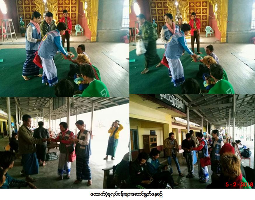 ဘေးအန္တရာယ်ဆိုင်ရာစီမံခန့်ခွဲမှုဦးစီးဌာန၊ ကချင်ပြည်နယ်ဦးစီးမှူးရုံးမှ တာဝန်ရှိသူများသည် ကချင်ပြည်နယ်၊ တနိုင်းမြို့နယ်၊ ပယင်းမှော်လုပ်ကွက်များမှ မိုးကောင်းမြို့သို့ (၅-၂-၂၀၁၈) ရက်နေ့၊ (၁၄း၀၀) နာရီအချိန်တွင် ရောက်ရှိလာသော နေရပ်ပြန်ပြည်သူ (၉) ဦးအား တစ်ဦးလျှင် တီရှပ် (၁)ထည် တဘက် (၁)ထည် ဆပ်ပြာ (၁)တောင့်နှင့် ဆန်ရိက္ခာ ၇ ရက်စာဖိုး (၂,၁၀၀)ကျပ်အား ထောက်ပံ့ပေးခဲ့ပြီး လူ (၉)ယောက်စာအတွက် ရထားလက်မှတ်ခ စုစုပေါင်း (၃၃,၃၀၀) ကျပ်တို့အား ထောက်ပံ့ပေးအပ်ခဲ့ပြီး မင်းပြား၊ ကျောက်တော် အရာတော်၊ ထန်းတပင်၊ ရသေ့တောင်၊ မန္တလေးမြို့များသို့ (၁၇:၄၅) အချိန်တွင် ထွက်ခွာသည့် မြစ်ကြီးနား-မန္တလေးရထားဘူတာရုံသို့ လိုက်ပါပို့ဆောင်ပေးခဲ့ကြောင်း သတင်းရရှိပါသည်။