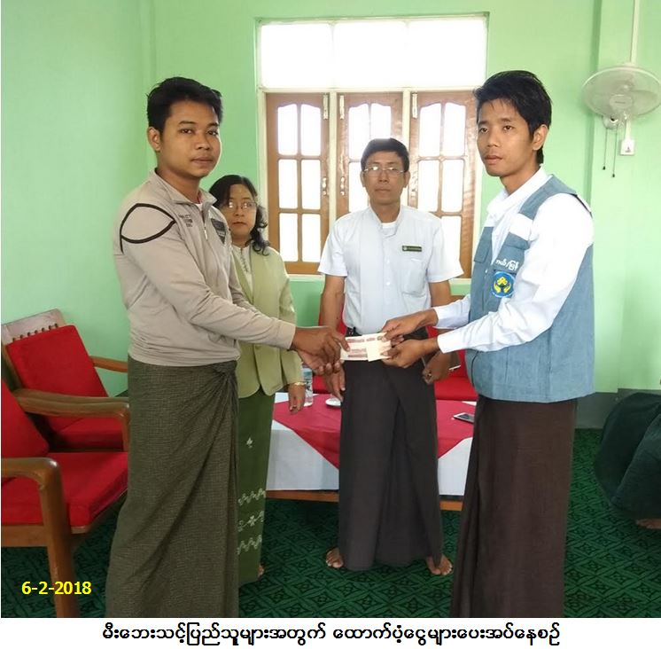 ဘေးအန္တရာယ်ဆိုင်ရာစီမံခန့်ခွဲမှုဦးစီးဌာန၊ ဧရာဝတီတိုင်းဒေသကြီးဦးစီးမှူးရုံးမှ တာဝန်ရှိသူများသည် ဧရာဝတီတိုင်းဒေသကြီး၊ ပုသိမ် ခရိုင်၊ ကျုံပျော်မြို့နယ်၊ အထောင်မြို့၊ အမှတ်(၄)ရပ်ကွက်၊ ဗိုလ်ချုပ်လမ်းတွင် (၅-၂-၂၀၁၈)ရက်နေ့၌ ဖြစ်ပွားခဲ့သော မီးဘေးကြောင့် မီးလောင်ကျွမ်းပျက်စီးခဲ့သည့် သွပ်မိုး၊ ထရံကာ၊ ပျဉ်ခင်း နေအိမ်(၁)လုံး၊ အိမ်ထောင်စု(၁)စုမှ လူဦးရေ(၄)ဦးအတွက် ဆန်ရိက္ခာ(၇)ရက်စာ (၈၄၀၀/-)ကျပ်၊ အိမ်ဆောက်ပစ္စည်းဖိုးရန်ပုံငွေ (၂၀၀၀၀၀/-)ကျပ်၊ စုစုပေါင်းရန်ပုံငွေ (၂၀၈၄၀၀/-)ကျပ်နှင့် Family Kits (၂၆)မျိုးပါ (၁)ပုံး(၈၂၀၀၀/-)ကျပ်၊ ပလပ်စတစ်ပုံး(၁)ပုံး (၆၁၅၀/-)ကျပ်တို့အား မီးဘေးသင့်ပြည်သူများ၏ (၆-၂-၂၀၁၈) ရက်နေ့တွင် လက်ဝယ်အရောက် ကွင်းဆင်းထောက်ပံ့ပေးအပ်ခဲ့ကြောင်း သိရှိရပါသည်။