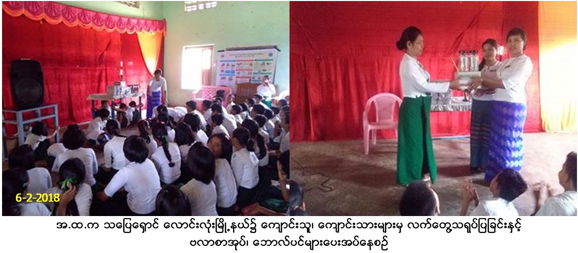 ဘေးအန္တရာယ်ဆိုင်ရာစီမံခန့်ခွဲမှုဦးစီးဌာန၊ တနင်္သာရီတိုင်းဒေသကြီးဦးစီးမှူးရုံးမှ တာဝန်ရှိသူများသည် (၆-၂-၂၀၁၈) ရက်နေ့တွင် အ.ထ.က သပြေရှောင် လောင်းလုံးမြို့နယ်၌ ကျောင်းသား၊ ကျောင်းသူအင်အား (၃၀၀)ဦးအား သဘာဝဘေးလျော့ပါးရေးအသိပညာပေးဟောပြောခြင်း၊ ဗလာစာအုပ်၊ ဘောလ်ပင်နှင့် ဗီနိုင်းပိုစတာဝေငှပေးခြင်းများ ဆောင်ရွက်ခဲ့ကြောင်း သတင်းရရှိပါသည်။
