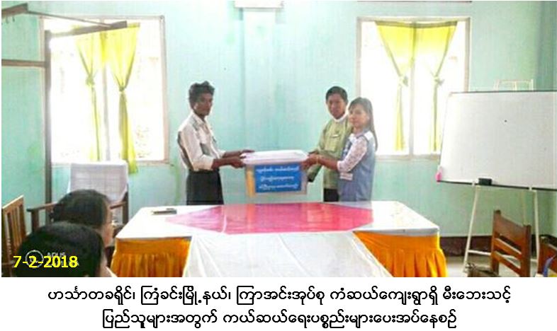 ဘေးအန္တရာယ်ဆိုင်ရာစီမံခန့်ခွဲမှုဦးစီးဌာန၊ ဟင်္သာတခရိုင်ဦးစီးမှူးရုံးမှ တာဝန်ရှိသူများသည် ဟင်္သာတခရိုင်၊ ကြံခင်းမြို့နယ်၊ ကြာအင်း အုပ်စု ကံဆယ်ကျေးရွာ (၅-၂-၂၀၁၈)ရက်နေ့ ဖြစ်ပွားခဲ့သော မီးဘေးသင့်အိမ်ထောင်စု(၁)စုအတွက် ကယ်ဆယ်ရေးပစ္စည်း(၁၆)မျိုး၊ မီးလောင်ကျွမ်းပျက်စီးခဲ့သော ဝါးအိမ်(၁)လုံးအတွက် အိမ်ဆောက်ပစ္စည်း ရန်ပုံငွေ(၁၀၀၀၀၀/-)ကျပ်၊ မီးဘေးသင့်ပြည်သူ(၃)ဦး အတွက် ဆန်ရိက္ခာ(၇)ရက်စာ ရန်ပုံငွေ (၆၃၀၀/-)ကျပ် စုစုပေါင်းရန်ပုံငွေ (၁၀၆၃၀၀/-)ကျပ်အား ကြံခင်းမြို့နယ် အထွေထွေအုပ်ချုပ် ရေးဦးစီးဌာနမှ တာဝန်ရှိသူများနှင့်အတူ (၇-၂-၂၀၁၈)ရက်နေ့တွင် ဘေးသင့်ပြည်သူလက်ဝယ်အရောက် ကွင်းဆင်းထောက်ပံ့ပေးအပ် ခဲ့ကြောင်း သိရှိရပါသည်။