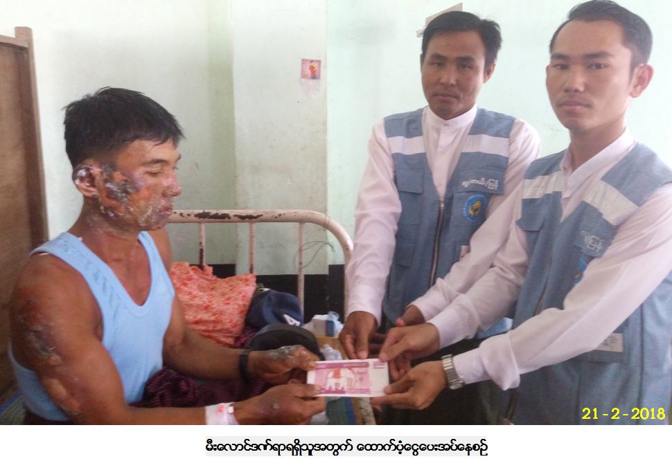 ဘေးအန္တရာယ်ဆိုင်ရာစီမံခန့်ခွဲမှုဦးစီးဌာန၊ ဧရာဝတီတိုင်းဒေသကြီးဦးစီးမှူးရုံးမှ တာဝန်ရှိသူများသည် ဧရာဝတီတိုင်းဒေသကြီး၊ ပုသိမ်ခရိုင်၊ ကန်ကြီးထောင့်မြို့နယ်၊ ရှမ်းရွာကျေးရွာအုပ်စု၊ သူဌေးကုန်းကျေးရွာ၌ (၂၀-၂-၂၀၁၈) ရက်နေ့တွင် ဖြစ်ပွားခဲ့သော မီးဘေးကြောင့် မီးလောင်ကျွမ်း ပျက်စီးခဲ့သည့် နေအိမ်(၁)လုံး၊ အိမ်ထောင်စု(၁) စုမှ လူဦးရေ (၃) ဦးအတွက် Unicef family Kit (၂၆) မျိုးပါ (၁)ပုံး(၈၂၀၀၀)၊ ပလတ်စတစ်ပုံး (၁)ပုံး(၆၁၅၀)၊ ဆန်ရိက္ခာ(၇)ရက်စာ ရန်ပုံငွေ (၆,၃၀၀)ကျပ်၊ အိမ်ဆောက်ပစ္စည်းဖိုးရန်ပုံငွေ (၁၀၀၀၀၀)ကျပ် စုစုပေါင်းရန်ပုံငွေ (၁၀၆၃၀၀) ကျပ်နှင့် မီးလောင်ဒဏ်ရာရရှိသူ (၁) ဦးအတွက် ထောက်ပံ့ငွေ (၅၀,၀၀၀) ကျပ်တို့အား (၂၁-၂-၂၀၁၈)ရက်နေ့တွင် မီးဘေးသင့်ပြည်သူများ၏ လက်ဝယ်အရောက် ထောက်ပံ့ပေးအပ်ခဲ့ကြောင်း သတင်းရရှိပါသည်။