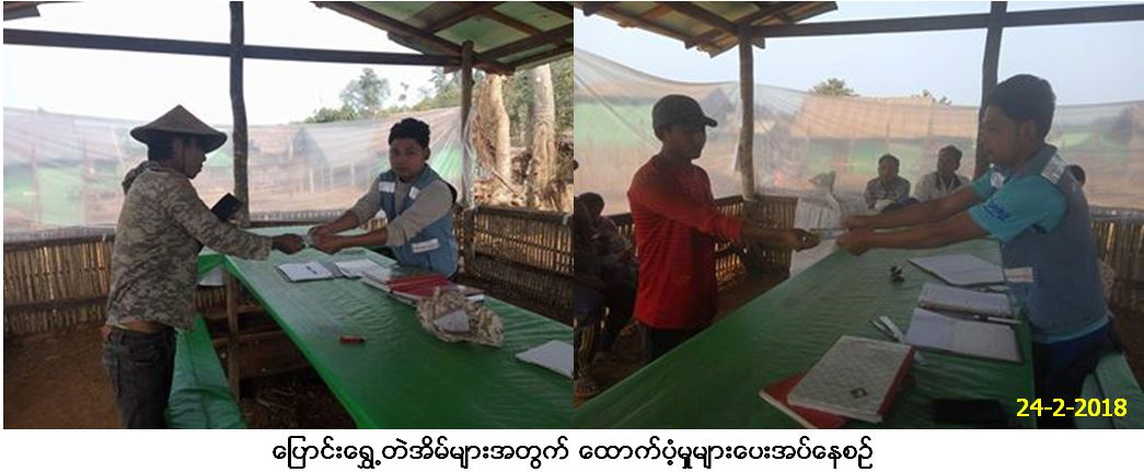 ဘေးအန္တရာယ်ဆိုင်ရာစီမံခန့်ခွဲမှုဦးစီးဌာန၊ ခန္တီးခရိုင်ဦးစီးမှူးရုံးမှ တာဝန်ရှိသူများသည် နန်စီပွန်ရတနာနယ်မြေရှိ ရေမဆေးကျောက်ရှာ ဖွေသူများအား ပြန်လည်နေရာချထားပေးရေး လုပ်ငန်းများ ဆောင်ရွက်လျက်ရှိရာ (၂၄-၂-၂၀၁၈) ရက်နေ့တွင် ပြောင်းရွှေ့တဲအိမ် (၁၂)လုံးအတွက် တစ်တဲလျှင် (၃၀၀၀၀/-) ကျပ်နှုန်းဖြင့် စုစုပေါင်း (၃၆၀၀၀၀/-) ကျပ် ထောက်ပံ့ပေးခဲ့ကြောင်း သတင်းရရှိပါသည်။