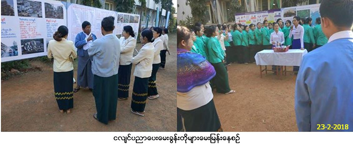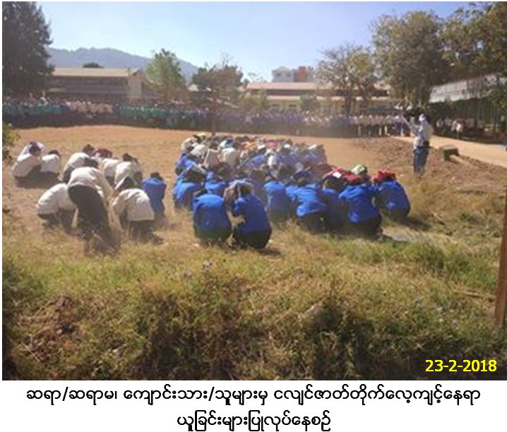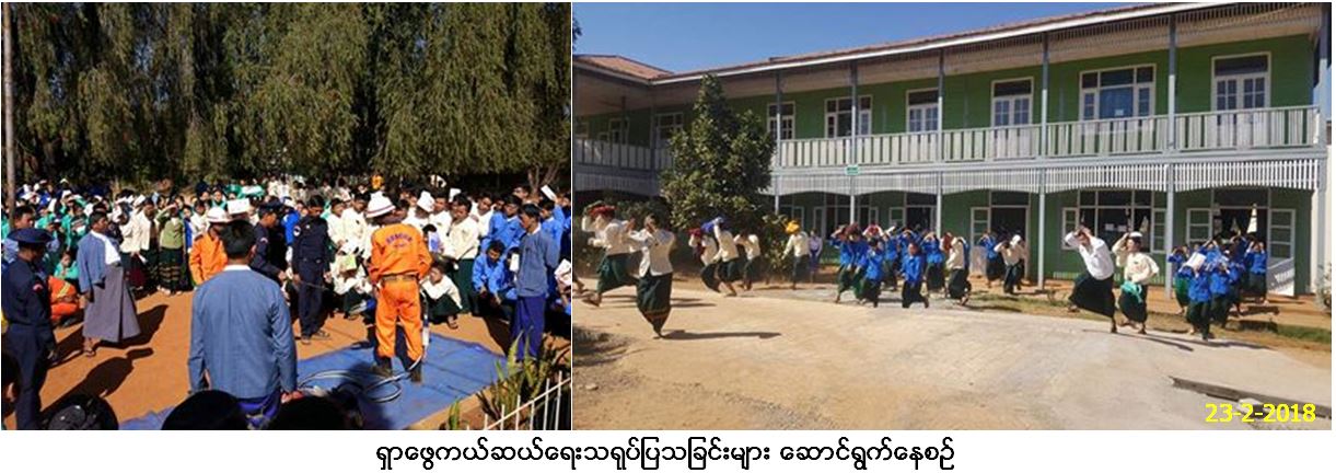 ဘေးအန္တရာယ်ဆိုင်ရာစီမံခန့်ခွဲမှုဦးစီးဌာန၊ ရှမ်းပြည်နယ်ဦးစီးမှူးရုံးမှ တာဝန်ရှိသူများသည် (၂၃-၂-၂၀၁၈)ရက်နေ့ နံနက်ပိုင်းတွင် ရှမ်းပြည်နယ်မီးသတ်ဦးစီးဌာနတို့ပူးပေါင်း၍ တောင်ကြီးပညာရေးကောလိပ်၌ လူဦးရေ(၇၀၀)ခန့်အား သဘာဝဘေးအသိပညာပေး ဟောပြောခြင်း၊ ရှာဖွေကယ်ဆယ်ရေးသရုပ်ပြသခြင်းများဆောင်ရွက်ခြင်း၊ ငလျင်ပညာပေးမေးခွန်းတိုများမေးမြန်းခြင်း၊ အသိပညာပေး ပြခန်းပြသခြင်းနှင့် ဆရာ/ဆရာမ၊ ကျောင်းသား/သူများမှ ငလျင်ဇာတ်တိုက်လေ့ကျင့်နေရာယူခြင်းများပြုလုပ်ခဲ့ကြောင်း သတင်းရရှိပါ သည်။