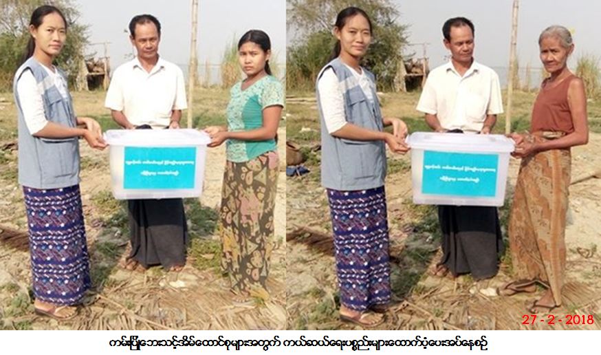 ဘေးအန္တရာယ်ဆိုင်ရာစီမံခန့်ခွဲမှုဦးစီးဌာန၊ ဟင်္သာတခရိုင်ဦးစီးမှူးရုံးမှ တာဝန်ရှိသူများသည် ဟင်္သာတမြို့နယ်၊ ခြင်ဘို့ကျေးရွာအုပ်စု၊ ကျောက်ရဲကျေးရွာတွင် (၂၆-၂-၂၀၁၈) နေ့၌ ကမ်းပြိုမှုကြောင့် ကြိုတင်ရွှေ့ပြောင်း အိမ်ခြေ (၁၂)လုံး၊ အိမ်ထောင်စု (၁၂)စု၊ လူဦးရေ (၅၀) ဦးတို့အတွက် ကယ်ဆယ်ရေးပစ္စည်း (၁၀)မျိုး၊ (၁၂) အိမ်ထောင်စာ ကယ်ဆယ်ရေးပစ္စည်းတန်ဖိုး (၂၂၂,၁၂၀) ကျပ်တို့ကို ( ၂၇-၂ -၂၀၁၈) ရက်နေ့တွင် ဘေးသင့် ပြည်သူများ၏ လက်ဝယ်သို့ ထောက်ပံ့ပေးအပ်ခဲ့ကြောင်း သတင်းရရှိပါသည်။