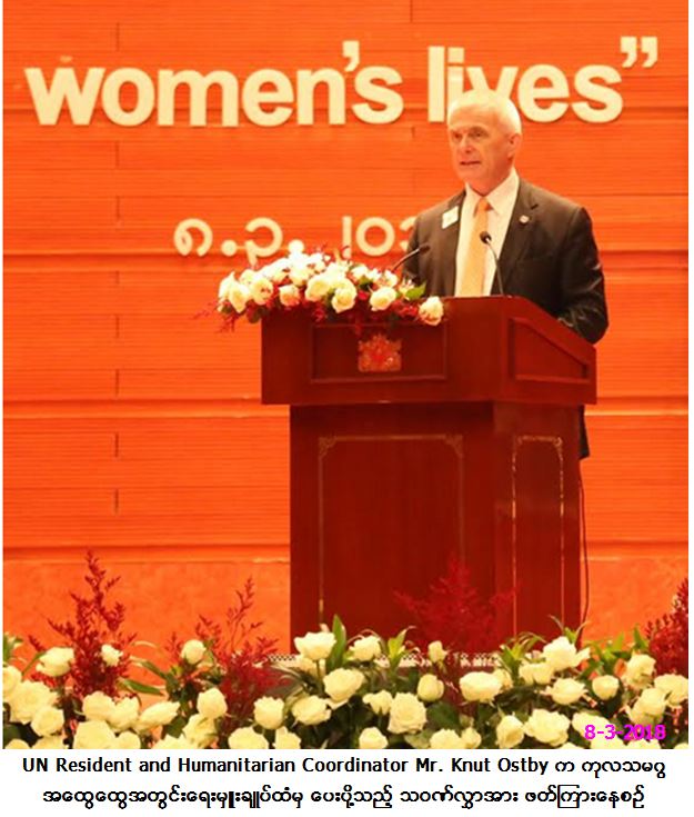 ထို့နောက် အပြည်ပြည်ဆိုင်ရာ အမျိုးသမီးများနေ့ အခမ်းအနားကို ဆက်လက်ကျင်းပရာ လူမှုဝန်ထမ်း၊ ကယ်ဆယ်ရေးနှင့် ပြန်လည်နေရာချထာရေးဝန်ကြီးဌာန ပြည်ထောင်စုဝန်ကြီး ဒေါက်တာဝင်းမြတ်အေးက နိုင်ငံတော်ဖွံ့ဖြိုးတိုးတက်ရေး ဆောင်ရွက်ရာ တွင် အမျိုးသမီးများအတွက် ယခုထက်ပိုပြီး ထည့်သွင်းစဉ်းစားပေးမည်ဆိုပါက မြန်မာနိုင်ငံအနေဖြင့် လျင်မြန်စွာ ဖွံ့ဖြိုးတိုးတက်လာ မည်ဖြစ်ကြောင်း၊ ကမ္ဘာတစ်ဝန်းလုံးရှိ သုတေသနအထောက်အထားများအရ ကျား၊ မ ရေးရာတန်းတူညီမျှမှု မရှိခြင်း ကို လျော့ချနိုင် မည်ဆိုပါက ကုန်ထုတ်လုပ်မှုစွမ်းအားနှင့် စီးပွားရေးဖွံ့ဖြိုး တိုးတက်လာမည် ဖြစ်ပါကြောင်း၊ ထို့ပြင် ငြိမ်းချမ်းရေး ဖြစ်စဉ်များတွင် အမျိုးသမီးများ ပူးပေါင်းပါဝင်သွားပါက ပိုမိုပြီးရေရှည် တည်တံ့ခိုင်မြဲ မှုရှိနိုင်မည်ဖြစ်ပြီး ကျား၊ မ ရေးရာတန်းတူညီမျှမှုရှိခြင်းက သဘာဝဘေးအန္တရာယ်များအား ခံနိုင်ရည်စွမ်းအား ပိုမိုအားကောင်းစေနိုင်ကြောင်းကို သုတေသီများကတွေ့ရှိထားပါကြောင်း။