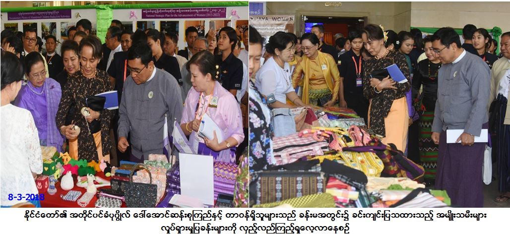 အခမ်းအနားတွင် နိုင်ငံတော်၏ အတိုင်ပင်ခံပုဂ္ဂိုလ် ဒေါ်အောင်ဆန်းစုကြည် က အမှာစကားပြောကြားရာတွင် “ ဒီနေ့ကျင်းပတဲ့ ၂၀၁၈ ခုနှစ်၊ အပြည်ပြည်ဆိုင်ရာ အမျိုးသမီးများနေ့ အခမ်းအနားကို တက်ရောက်လာကြတဲ့ ဧည့်သည်တော်များ အားလုံးကို ကြိုဆို နှုတ်ခွန်းဆက်ပါတယ်။ အမျိုးသားများကလည်း အမျိုးသမီးများနေ့မှာ အားလုံးတက်တက်ကြွကြွနဲ့ ပါဝင်ပြီးတော့ ကူညီကြဖို့လိုပါတယ်။