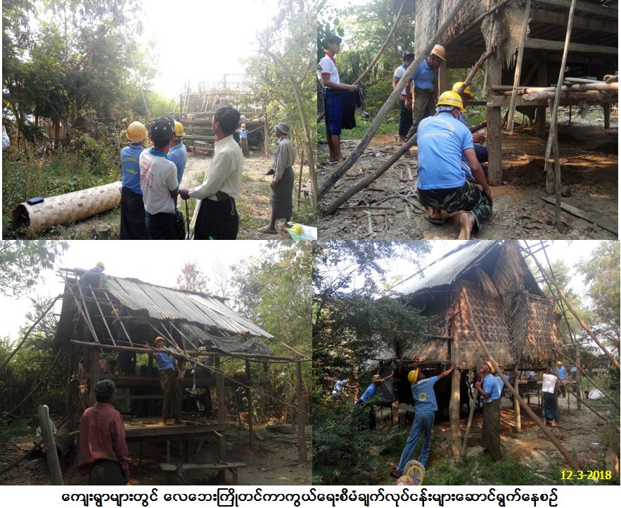 လူမှုဝန်ထမ်း၊ ကယ်ဆယ်ရေးနှင့် ပြန်လည်နေရာချထားရေးဝန်ကြီးဌာန၊ ဘေးအန္တရာယ်ဆိုင်ရာစီမံခန့်ခွဲမှှုဦးစီးဌာန၊ ပခုက္ကူခရိုင် ဦးစီးမှူးရုံး မှ တာဝန်ရှိသူများသည် (၁၂-၃-၂၀၁၈)ရက်နေ့တွင် ပခုက္ကူမြို့နယ်၊ ကူကျွန်း-လက်ပံကျွန်းကျေးရွာအုပ်စု၊ လက်ပံ ကျွန်းကျေးရွာ၌ လေဘေးအန္တရာယ် ကြိုတင်ကာကွယ်ပြင်ဆင်ရေးလုပ်ငန်းများဖြစ်သော လူနေအိမ်ပတ်ဝန်းကျင်တွင် ဘေးအန္တရာယ် ဖြစ်နိုင်ခြေများနှင့် အိမ်၏ကြံ့ခိုင်မှုများကို စစ်ဆေး၍ အိမ်များပြုပြင်ပေးခြင်း၊ အိမ်အနီးရှိ ကျိုးကျနိုင်သော သစ်ပင်၊ သစ်ကိုင်းများအား ခုတ်ထွင်ရှင်းလင်းပေးခြင်း၊ လက်ကမ်းစာစောင်များ၊ နံရံကပ်ပိုစတာများ ပေးအပ်ခြင်းနှင့် အသိပညာပေးလုပ်ငန်းများကို ပုညမုဒိတာ (ကျန်းမာရေး စောင့်ရှောက်မှှုနှင့် သွေးလှူအသင်း)၊ ထန်းစေတနာ (သွေးလှူအသင်း အမှတ်-၁၄)၊ ကျေးရွာနေ ပြည်သူများနှင့်အတူ ဆောင်ရွက်လျက်ရှိပါသည်၊၊