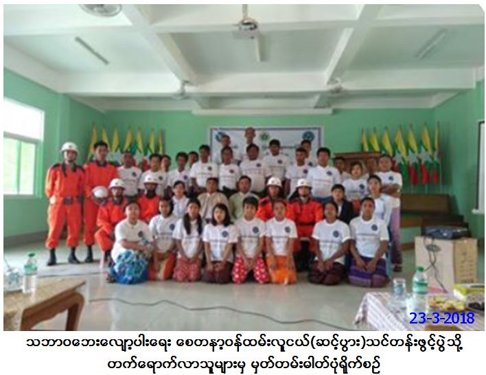 ဘေးအန္တရာယ်ဆိုင်ရာစီမံခန့်ခွဲမှုဦးစီးဌာန၊ ပြည်ထောင်စုနယ်မြေ၊ နေပြည်တော်တိုင်းဦးစီးမှူးရုံးမှ တာဝန်ရှိသူများသည်(၂၃-၃-၂၀၁၈) ရက်နေ့ (၀၉:၀၀)အချိန်တွင် ပျဉ်းမနားမြို့နယ်၊ အထွေထွေအုပ်ချုပ်ရေးဦးစီးဌာန၊ အစည်းအဝေးခန်းမ၌ သဘာဝဘေးလျော့ပါးရေး စေတနာ့ဝန်ထမ်းလူငယ်(ဆင့်ပွား)သင်တန်း (၃/၂၀၁၈)ကို ဖွင့်လှစ်ခဲ့ရာ ပျဉ်းမနားမြို့နယ်အုပ်ချုပ်ရေးမှူးမှ အဖွင့်အမှာစကားပြောကြားခဲ့ပါသည်။ ထိုသင်တန်းသို့ အထွေထွေအုပ်ချုပ်ရေးဦးစီးဌာနမှ မြို့နယ်အုပ်ချုပ်ရေးမှူး၊ မီးသတ်ဦးစီးဌာနမှ တပ်ဖွဲ့ဝင်များ၊ ကြက်ခြေနီတပ်ဖွဲ့ဝင်များနှင့် သင်တန်းသား၊ သင်တန်းသူ (၃၀)ဦးတို့တက်ရောက်ခဲ့ကြောင်း သတင်းရရှိပါသည်။