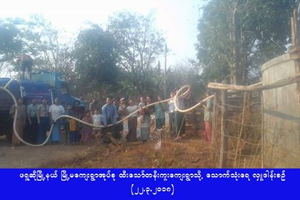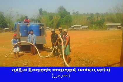 ဘေးအန္တရာယ်ဆိုင်ရာစီမံခန့်ခွဲမှုဦးစီးဌာန၊ ကယားပြည်နယ်ဦးစီးမှူးရုံးမှတာဝန်ရှိသူများသည် (၂၂-၃-၂၀၁၈)ရက်နေ့တွင် ဒီးမော့ဆို မြို့နယ်၊ ဒေါတမကြီးကျေးရွာအုပ်စု၊ ဒေါတမမကြီးကျေးရွာ၊ ဖရူဆိုမြို့နယ်၊ မိုဆိုကျေးရွာအုပ်စု ဒီးကူးလယ်ကျး ရွာနှင့် မြို့မကျေးရွာအုပ်စု၊ ခေါသမောကျေးရွာ၊ ထီးသော်တနီးကူးကျေးရွာနှင့် လောခု ခူကျေးရွာများသို့ သောက်သုံးရေများ သွားရောက်ဖြန့်ဝေပေးခဲ့ ကြောင်း သတင်းရရှိပါသည်။