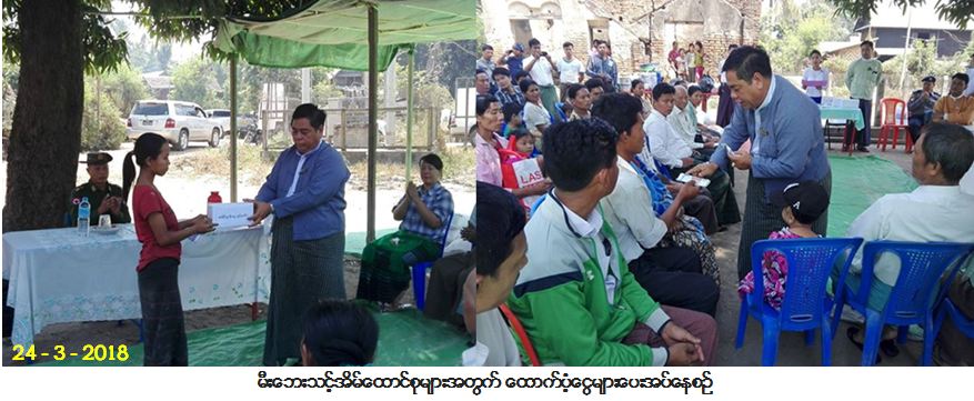 ဘေးအန္တရာယ်ဆိုင်ရာစီမံခန့်ခွဲမှုဦးစီးဌာန၊ ပြည်ထောင်စုနယ်မြေ၊ နေပြည်တော်တိုင်းဦးစီးမှူးရုံးမှ တာဝန်ရှိသူ များသည် ပျဉ်းမနားမြို့နယ်၊ နတ်သူရဲအုပ်စု၊ ကြံဘိုကျေးရွာ၌ (၂၃-၃-၂၀၁၈) ရက်နေ့တွင် ဖြစ်ပွားခဲ့သော မီးဘေးကြောင့် ဘေးသင့်အိမ်ထောင်စု (၆) စုအတွက် အိမ်ဆောက်ပစ္စည်းဖိုးငွေ (၁,၀၀၀,၀၀၀ိ/-) ကျပ်နှင့် လူဦးရေ (၂၇) ဦးအတွက် ဆန်ရိက္ခာဖိုးငွေ (၅၆,၇၀၀ိ/-) ကျပ် စုစုပေါင်း ထောက်ပံ့ငွေ (၁,၀၅၆,၇၀၀ိ/-) ကျပ်တို့အား (၂၄-၃-၂၀၁၈) ရက်နေ့တွင် သွားရောက်ထောက်ပံ့ပေးအပ်ခဲ့ကြောင်း သတင်းရရှိပါသည်။ အဆိုပါ ထောက်ပံ့ပေးအပ်ပွဲသို့ နေပြည်တော် ကောင်စီဝင် ဗိုလ်မှူးကြီး မင်းနောင်၊ ပြည်သူ့ လွှတ်တော် ကိုယ်စားလှယ် ဦးသန်းစိုးအောင်နှင့် မြို့နယ်အဆင့်ဌာနဆိုင်ရာတာဝန်ရှိသူများ တက်ရောက်ခဲ့ကြောင်း သတင်းရရှိပါသည်။