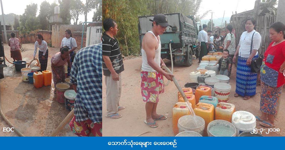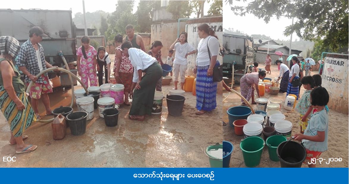 ဘေးအန္တရာယ်ဆိုင်ရာ စီမံခန့်ခွဲမှုဦးစီးဌာန၊ ကျိုင်းတုံခရိုင်ဦးစီးမှူးရုံးမှ တာဝန်ရှိသူများသည် (၂၅-၃-၂၀၁၈) ရက်နေ့၊ ညနေ (၁၅း၀၀) နာရီအချိန်တွင် နွေရာသီရောက်သဖြင့် သောက်သုံးရေရှားပါးလျက်ရှိသည့် ကျိုင်းတုံမြို့နယ်၊ အမှတ် ၁ ရပ်ကွက်၊ စိန်ဂျိုးဇက်အာခါရွာသို့ ရေဂါလံ ၇၅၀ ဆန့်၊ ကား ၄ စီးဖြင့် ရေဂါလံစုစုပေါင်း ၃၀၀၀ အား သွားရောက် ပေးဝေခဲ့ကြောင်း သိရှိရပါသည်။