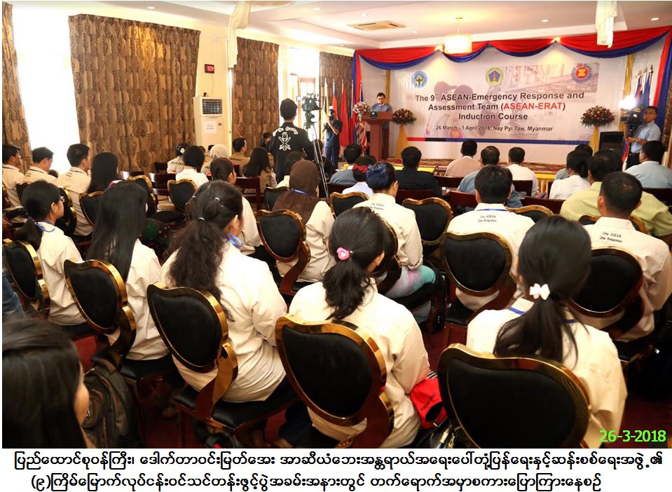 မြန်မာနိုင်ငံမှ အိမ်ရှင်နိုင်ငံအဖြစ် ပထမဆုံးအကြိမ် လက်ခံကျင်းပပြုလုပ်သည့် အာဆီယံဘေးအန္တရာယ်အရေးပေါ်တုံ့ပြန်ရေးနှင့်ဆန်းစစ်လေ့လာရေးအဖွဲ့၏(၉)ကြိမ်မြောက် လုပ်ငန်းဝင်သင်တန်း ဖွင့်ပွဲအခမ်းအနားကို (၂၆-၃-၂၀၁၈)ရက်နေ့၊ နံနက် (၀၉:၀၀)နာရီ အချိန်တွင် နေပြည်တော်၊ ရွှေနန်းတော်ဟိုတယ်၌ ကျင်းပပြုလုပ်ရာ လူမှုဝန်ထမ်း၊ ကယ်ဆယ်ရေးနှင့် ပြန်လည်နေရာချထားရေးဝန်ကြီးဌာန၊ ပြည်ထောင်စုဝန်ကြီး၊ ဒေါက်တာ ဝင်းမြတ်အေးတက်ရောက်အဖွင့်အမှာစကားပြောကြားခဲ့ပါသည်။