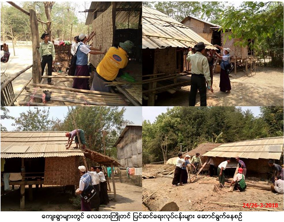 ဘေးအန္တရာယ်ဆိုင်ရာစီမံခန့်ခွဲမှုဦးစီးဌာန၊ ပြည်ခရိုင်ဦးစီးမှူးရုံးမှ တာဝန်ရှိသူများသည် (၂၄-၃-၂၀၁၈)ရက်နေ့နှင့် (၂၆-၃ -၂၀၁၈) ရက်နေ့တို့တွင် ပြည်ခရိုင်၊ ရွှေတောင်မြို့နယ်၊ ကျွန်းကလေးကျေးရွာ အုပ်စု ပဒေသါကျေးရွာနှင့် ဇီးကျွန်းကျေးရွာအုပ်စု ဧရာဦးကျေးရွာ တို့တွင် လေဘေးကြိုတင်ပြင် ဆင်ရေးအတွက် နေအိမ်များ ခိုင်ခံ့မှု ရှိ/ မရှိ စစ်ဆေးခြင်း၊ အမိုးအကာများပြင်ဆင်ပေးခြင်း၊ နေအိမ် များကြံ့ခိုင်မှုရှိစေရန် သွပ်နန်းကြိုးများ တုတ်ပေးခြင်း စသည့်လုပ်ငန်းများ ကို ရွှေတောင်မြို့နယ် အထွေထွေအုပ်ချုပ်ရေးဦးစီးဌာန၊ ရွှေတောင်လူမှုကယ်ဆယ်ရေး Rescue အဖွဲ့များနှင့် ကျေးရွာများရှိ စေတနာ့ဝန်ထမ်းလုပ်အား ရှင်များနှင့်အတူပူးပေါင်း၍ သွားရောက် ဆောင်ရွက်ပေးခဲ့ကြောင်း သတင်းရရှိပါသည်။