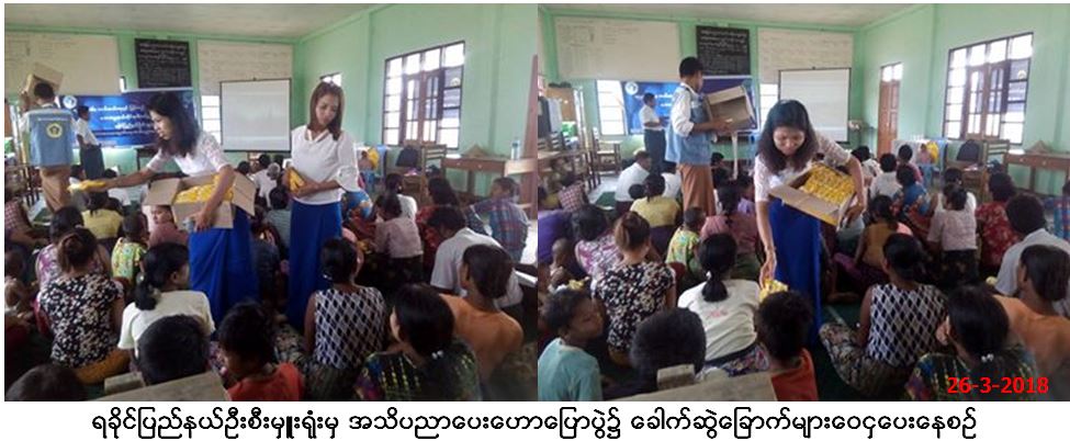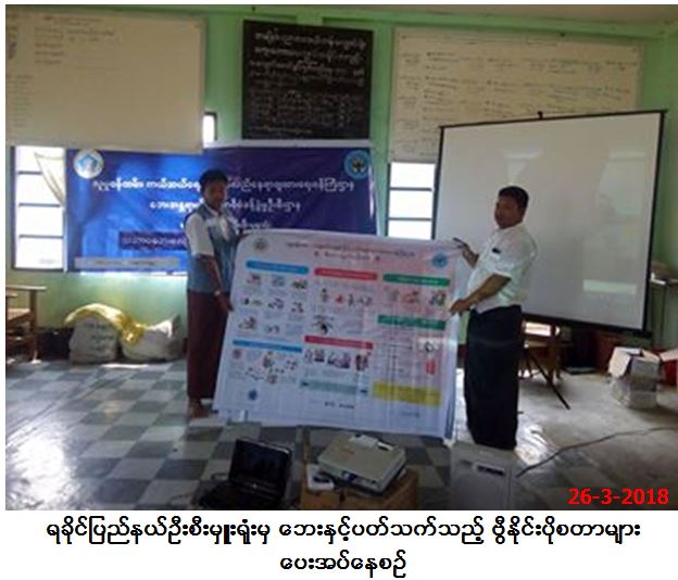 ဘေးအန္တရာယ်ဆိုင်ရာစီမံခန့်ခွဲမှုဦးစီးဌာန၊ ရခိုင်ပြည်နယ်ဦးစီးမှူးရုံးမှှ တာဝန်ရှိသူများသည် (၂၆-၃-၂၀၁၈)ရက်နေ့တွင် စစ်တွေ မြို့နယ်၊ ချောင်းနွယ်မင်းဂံကျေးရွာ၌ (၁၀:၀၀)အချိန်မှ(၁၁း၃၀)အချိန်ထိ ကျေးရွာသူ၊ ကျေးရွာသား(၁၀၀)ဦးခန့်အား သဘာဝဘေး အသိပညာပေးဟောပြောပွဲပြုလုပ်ခဲ့ပြီး လက်ကမ်းစာစောင်များ၊ သဘာဝဘေးဗွီနိုင်းပိုစတာများနှင့် ခေါက်ဆွဲခြောက်များဖြန့်ဝေပေး ခဲ့ကြောင်း သတင်းရရှိပါသည်။