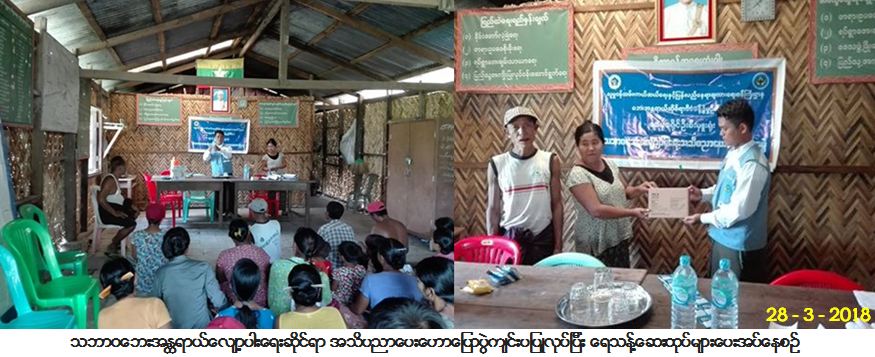 ဘေးအန္တရာယ်ဆိုင်ရာစီမံခန့်ခွဲမှုဦးစီးဌာန၊ ဖျာပုံခရိုင်ဦးစီးမှူးရုံးမှ တာဝန်ရှိသူများသည် (၂၈-၃-၂၀၁၈) ရက်နေ့(၁၂း၃၀) နာရီအချိန်တွင် ဖျာပုံခရိုင်၊ ဖျာပုံမြို့၊ ဖျာပုံတမံကျေးရွာ အုပ်စု အုပ်ချုပ်ရေးမှူးရုံးတွင် ပြည်သူလူထု (၁၂၀) ဦးခန့်အား သဘာဝဘေးအန္တရာယ်လျော့ပါးရေးဆိုင်ရာ အသိပညာပေး ဟောပြောပွဲ ကျင်းပပြုလုပ်ခဲ့ပြီး World Vesion မှ လှူဒါန်းသော ရေသန့်ဆေးထုပ်များကို ဖြန့်ဝေပေးခဲ့ပြီး သုံစွဲပုံ နည်း စနစ် များအား လက်တွေ့ပြသခြင်း၊ အသိပညာပေး လက်ကမ်းစာစောင်များ ဖြန့်ဝေပေးခြင်းနှင့် ဗီနိုင်းပိုစတာများ ပေးအပ်ခြင်းများကို ဆောင်ရွက်ခဲ့ပါကြောင်း သတင်းရရှိပါသည်။
