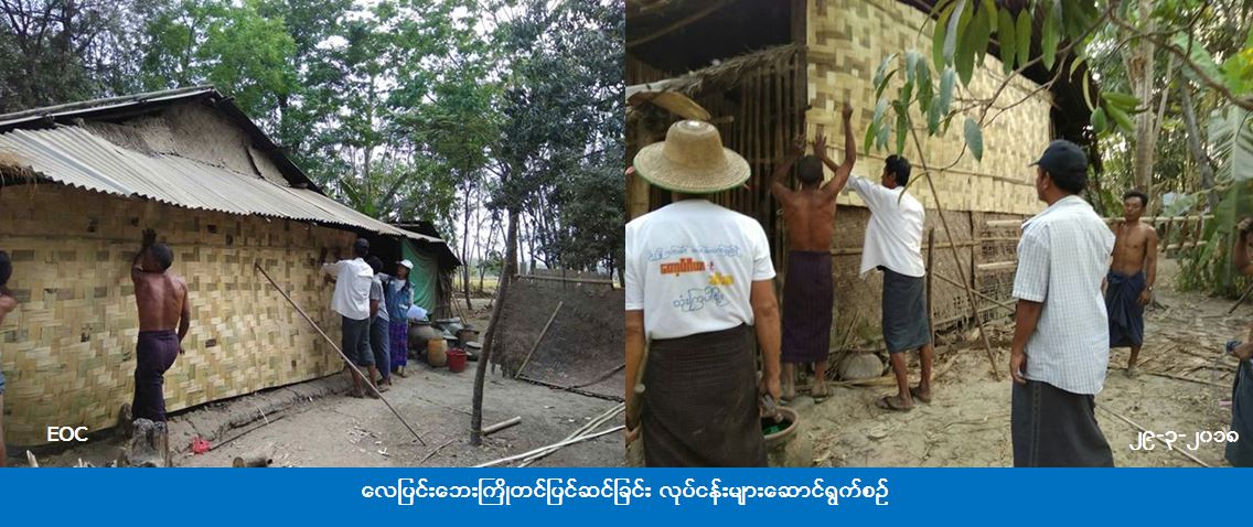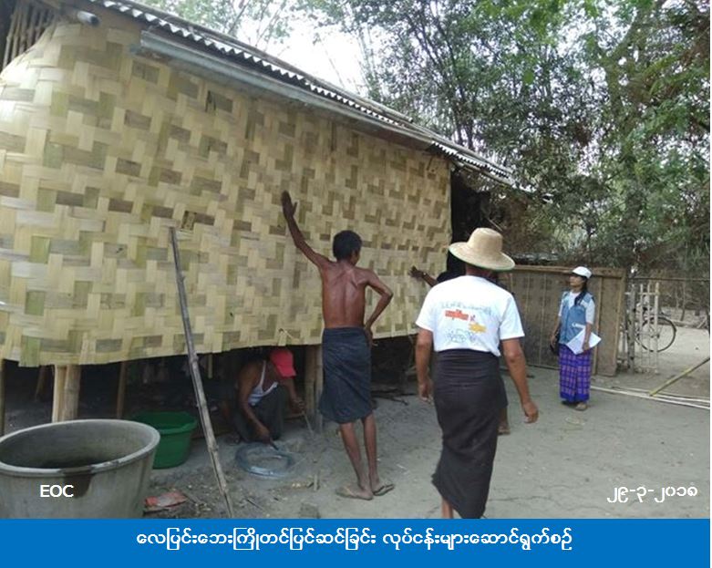 ဟင်္သာတခရိုင်ဦးစီးမှူးရုံး (ဘစမ) မှ တာဝန်ရှိသူများသည် (၂၉-၃-၂၀၁၈) ရက်နေ့တွင် မြန်အောင်မြို့နယ် တယ်ကုန်းအုပ်စုအတွင်း ရေနစ်ကွင်းကျေးရွာရှိ အိမ်ထောင်စုများအတွက် လေပြင်းဘေးကြိုတင်ပြင်ဆင်ရန် ခိုင်ခံ့မှုအားနည်းသော အိမ်များအား ပြင်ဆင်ပေးခြင်းများကို ကွင်းဆင်းဆောင်ရွက်မှုများ ပြုလုပ်ခဲ့ကြောင်း သိရှိရပါသည်။