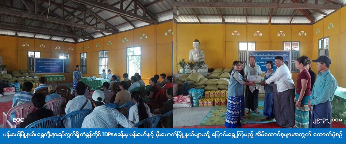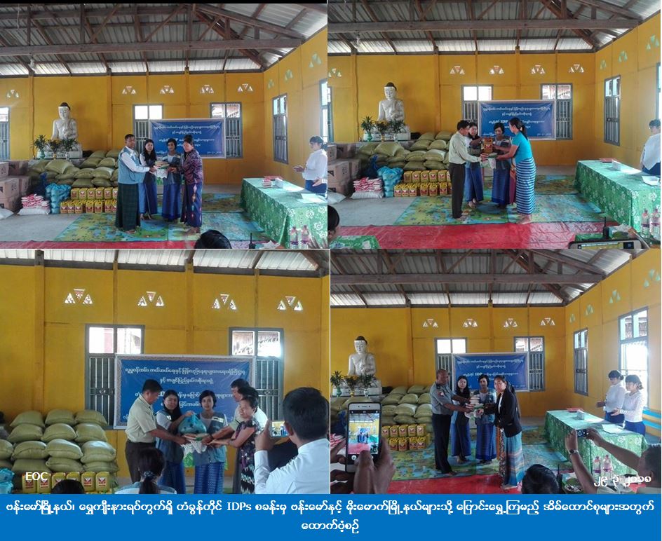 လူမှုဝန်ထမ်း၊ ကယ်ဆယ်ရေးနှင့် ပြန်လည်နေရာချထားရေးဝန်ကြီးဌာနမှ ဗန်းမော်ခရိုင်၊ ဗန်းမော်မြို့နယ်၊ ရွှေကျီးနားရပ်ကွက်ရှိ တံခွန်တိုင် IDPs စခန်းမှ ဗန်းမော်နှင့် မိုးမောက်မြို့နယ်များသို့ ပြောင်းရွှေ့ကြမည့် အိမ်ထောင်စု(၂၀)စု၊ လူဦးရေ(၉၅)ဦးတို့အတွက် ထောက်ပံ့ခြင်းအခမ်းအနားအား (၃၀-၃-၂၀၁၈) ရက်နေ့ (၀၉း၀၀)နာရီတွင် တံခွန်တိုင်စခန်း၌ ကျင်းပပြုလုပ်ခဲ့ရာ ဘေးအန္တရာယ်ဆိုင်ရာစီမံခန့်ခွဲမှုဦးစီးဌာန၊ ကချင်ပြည်နယ်ဦးစီးမှူးရုံးမှ ညွှန်ကြားရေးမှူး ဒေါ်လှကေသီမာ က အဖွင့်အမှာစကားပြောကြားခဲ့ပြီး ပြောင်းရွှေ့မည့် မိသားစုများအား တန်ဖိုးကျပ် (၃၆၇၄၀၀၀ိ/-) ရှိ ပစ္စည်း(၃၂)မျိုးပါ Relief Kit (၂၀)စုံနှင့် ဆန်၊ ဆီ၊ ဆား၊ ပဲ (၂) လစာ၊ တစ်အိမ်ထောင်လျှင် ပြောင်းရွှေ့စရိတ် (၁၀၀၀၀၀ိ/-)နှုန်းဖြင့် ကျပ်သိန်း(၂၀)၊ စုစုပေါင်းတန်ဖိုးကျပ်(၅၆၇၄၀၀၀ိ/-)ရှိ ထောက်ပံ့ငွေနှင့် ထောက်ပံ့ပစ္စည်းများအား ထောက်ပံ့ပေးအပ်ခဲ့ပါသည်။ ၎င်းအခမ်းအနားတွင် ခရိုင်အုပ်ချုပ်ရေးမှူး၊ မြို့နယ်အုပ်ချုပ်ရေးမှူး၊ မြို့နယ်ရဲတပ်ဖွဲ့မှူးနှင့် ခရိုင်/မြို့နယ်ဌာနဆိုင်ရာများ တက်ရောက်ခဲ့ကြပြီး IDPs မိသားစုများအား ရင်းရင်းနှီးနှီးတွေ့ဆုံ၍ အားပေးစကားပြောကြားကာ လိုအပ်သည့် အကူအညီများအား ပေးသွားမည်ဖြစ်ပါကြောင်းနှင့် IDPs မိသားစုများမှလည်း ကျေးဇူးတင်စကား ပြန်လည်ပြောကြားခဲ့ကြောင်း သိရှိရပါသည်။