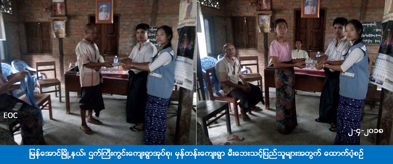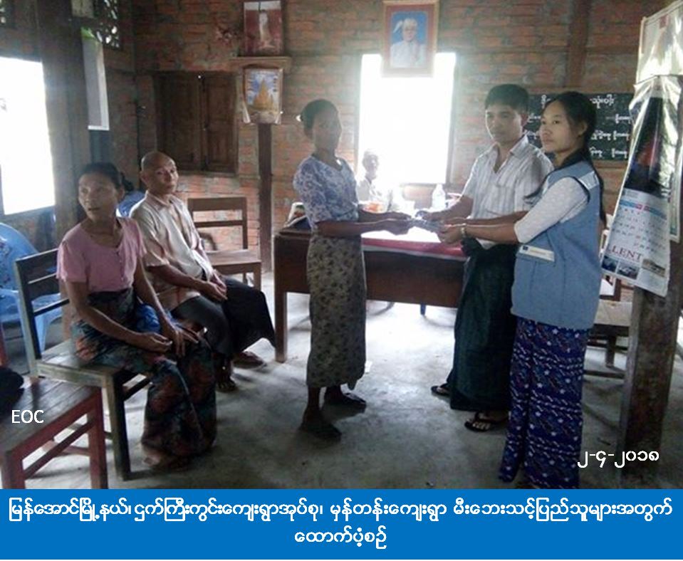 မြန်အောင်မြို့နယ်၊ ဌက်ကြီးကွင်းကျေးရွာအုပ်စု၊ မှန်တန်းကျေးရွာ၌ (၂၆-၃-၂၀၁၈) ရက်နေ့တွင် ဖြစ်ပွားသော မီးဘေးကြောင့် ဘေးသင့်ခဲ့သည့် အိမ်ခြေ (၃) လုံး၊ အိမ်ထောင်စု (၃) စု၊ လူဦးရေ (၆) ဦးတို့အတွက် အိမ်ဆောက်ပစ္စည်းဖိုး ၃ သိန်း၊ ဆန်ရိက္ခာဖိုး ၁၂၆၀၀ ကျပ်၊ စုစုပေါင်းကယ်ဆယ်ရေးရန်ပုံငွေ (၃၁၂၆၀၀) ကျပ်တို့ကို ဘေးအန္တရာယ်ဆိုင်ရာစီမံခန့်ခွဲမှုဦးစီးဌာန၊ ဟင်္သာတခရိုင်ဦးမှူးရုံးမှ တာဝန်ရှိသူများသည် (၂-၄ -၂၀၁၈) ရက်နေ့တွင် ဘေးဖြစ်ပွားခဲ့သည့်နေရာသို့ သွားရောက်ကာ ဘေးသင့်ပြည်သူများ၏ လက်ဝယ်သို့ ပေးအပ်ခဲ့ကြောင်း သိရှိရပါသည်။