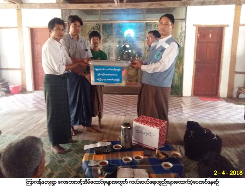 ဘေးအန္တရာယ်ဆိုင်ရာစီမံခန့်ခွဲမှုဦးစီးဌာန၊ မကွေးတိုင်းဒေသကြီးဦးစီးမှူးရုံးမှ တာဝန်ရှိသူများသည် မကွေး တိုင်းဒေသကြီး၊ မကွေးမြို့နယ်၊ ကြာကန်ကျေးရွာ၌ (၁-၄-၂၀၁၈) ရက်နေ့တွင် လေပြင်းတိုက်ခတ်မှုကြောင့် လူနေအိမ် (၁၄၄) လုံး ပျက်စီးခဲ့ပါသည်။ အဆိုပါ လေဘေးသင့် လုံးဝပျက်စီးနေအိမ် (၃၂) လုံးအတွက် ကယ်ဆယ်ရေးပစ္စည်း(၁၆) မျိုး (၃၂) အိမ်ထောင်စာ၊ အိမ်ဆောက်ပစ္စည်းဖိုးငွေ (၃,၂၀၀,၀၀၀ိ/-) ကျပ်၊ အမိုးလန်နေအိမ် (၄၂) လုံးအတွက် တစ်အိမ်လျှင် (၆၀,၀၀၀ိ/-) ကျပ်နှုန်းဖြင့် (၂,၅၂၀,၀၀၀ိ/-) ကျပ်၊ တစ်စိတ်တစ်ပိုင်းပျက်စီးနေအိမ် (၇၀) လုံးအတွက် တစ်အိမ်လျှင် (၃၀,၀၀၀ိ/-) ကျပ်နှုန်းဖြင့် (၂,၁၀၀,၀၀၀ိ/-) ကျပ်၊ စုစုပေါင်း ထောက်ပံ့ငွေ (၇,၈၂၀,၀၀၀ိ/-) ကျပ်၊ လူဦးရေ (၆၃၅) ဦးအတွက် ဆန်ရိက္ခာဖိုးငွေ (၇) ရက် စာ (၁,၃၃၃,၅၀၀ိ/-)ကျပ်၊ စုစုပေါင်းထောက်ပံ့ငွေ (၉,၁၅၃,၅၀၀ိ/-) ကျပ်နှင့် ကယ်ဆယ်ရေးပစ္စည်း (၉) မျိုး (၁၁၂) အိမ်ထောင်စာတို့အား (၂-၄-၂၀၁၈) ရက် နေ့တွင် သွားရောက်ထောက်ပံ့ပေးအပ်ခဲ့ကြောင်း သတင်း ရရှိပါသည်။