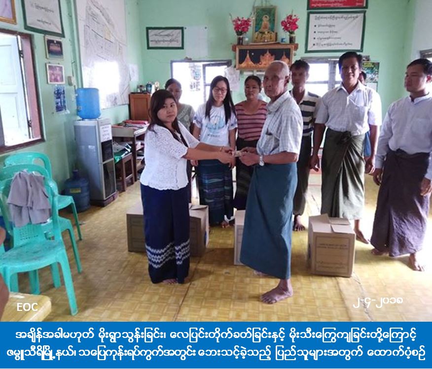 ပြည်ထောင်စုနယ်မြေ၊ နေပြည်တော်အတွင်း (၃၁-၃-၂၀၁၈) ရက်နေ့ (၁ရး၃၀) အချိန်ခန့်တွင် အချိန်အခါမဟုတ် မိုးရွာသွန်းခြင်း၊ လေပြင်းတိုက်ခတ်ခြင်းနှင့် မိုးသီးကြွေကျခြင်းတို့ဖြစ်ပွားခဲ့ရာ ဇမ္ဗူသီရိမြို့နယ်၊ သပြေကုန်းရပ်ကွက်အတွင်းရှိ သစ်ပင်ပိ ပြိုလဲပျက်စီးနေအိမ် (၁) လုံးနှင့် အမိုးလန်အိမ် (၆) လုံးအတွက် အိမ်ဆောက်ပစ္စည်းဖိုးငွေ (၅) သိန်းနှင့် လူဦးရေ (၄၃) ဦးအတွက် ဆန်ရိက္ခာဖိုးငွေ (၉၀၃၀၀) ကျပ်အား ပြည်ထောင်စုနယ်မြေ၊ နေပြည်တော်တိုင်းဦးစီးမှူးရုံး (ဘစမ) မှ တာဝန်ရှိသူများသည် (၂-၄-၂၀၁၈) ရက်နေ့ (၁၅း၀၀) နာရီအချိန်တွင် သွားရောက်ထောက်ပံ့ပေးခဲ့ကြောင်း သိရှိရပါသည်။