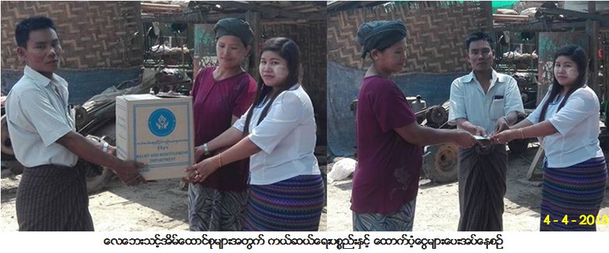 ဘေးအန္တရာယ်ဆိုင်ရာစီမံခန့်ခွဲမှုဦးစီးဌာန၊ ပြည်ထောင်စုနယ်မြေ၊ နေပြည်တော်တိုင်းဦးစီးမှူးရုံးမှ တာဝန်ရှိသူ များသည် (၂-၄-၂၀၁၈) ရက်နေ့တွင် ဖြစ်ပွားခဲ့သော လေဘေးကြောင့် လယ်ဝေးမြို့နယ်၊ ညိုပင်ကျေးရွာ လေဘေးသင့် ပြိုလဲနေအိမ် (၃) လုံးအတွက် ကယ်ဆယ်ရေးပစ္စည်း (၁၆)မျိုး၊ (၃) အိမ်ထောင်စာ၊ အိမ်ဆောက်ပစ္စည်းဖိုးငွေ တစ်အိမ်လျှင် (၁၀၀,၀၀၀ိ/-) ကျပ်နှုန်းဖြင့် (၃၀၀,၀၀၀ိ/-) ကျပ်၊ အမိုးလန်နေအိမ် (၈) လုံးအတွက် ကယ်ဆယ်ရေးပစ္စည်း (၁၀)မျိုး၊ (၈) အိမ်ထောင်စာ၊ အိမ်ဆောက်ပစ္စည်းဖိုးငွေ တစ်အိမ်လျှင် (၅၀,၀၀၀ိ/-) ကျပ်နှုန်းဖြင့် (၄၀၀,၀၀၀ိ/-) ကျပ်၊ တစ်စိတ်တစ်ပိုင်းပျက်စီးနေအိမ် (၅) လုံးအတွက် တစ်အိမ်လျှင် (၃၀,၀၀၀ိ/-) ကျပ်နှုန်းဖြင့် (၁၅၀,၀၀၀ိ/-) ကျပ်၊ လူဦးရေ (၅၆) ဦးအတွက် ဆန်ရိက္ခာဖိုးငွေ (၁၁၇,၆၀၀ိ/-)ကျပ်၊ စုစုပေါင်းထောက်ပံ့ငွေ (၉၆၇,၆၀၀ိ/-) ကျပ်တို့အား (၄-၄-၂၀၁၈) ရက်နေ့တွင် သွားရောက်ထောက်ပံ့ပေးအပ်ခဲ့ကြောင်း သတင်းရရှိပါသည်။