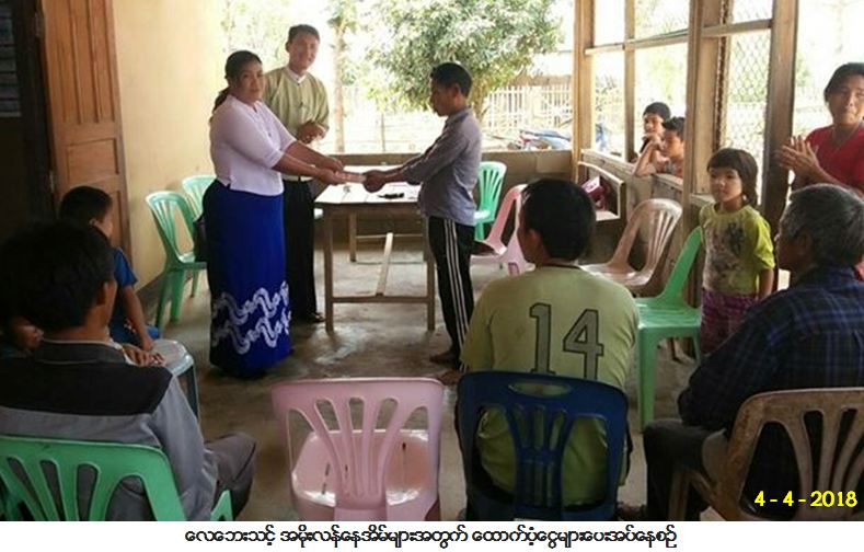 ဘေးအန္တရာယ်ဆိုင်ရာစီမံခန့်ခွဲမှုဦးစီးဌာန၊ ကျိုင်းတုံခရိုင်ဦးစီးမှူးရုံးမှ တာဝန်ရှိသူများသည် တာချီလိတ် မြို့နယ်၊ ကျိုင်းလပ်မြို့၊ မိုင်းပါလျိုးကျေးရွာအုပ်စု၊ နမ့်ဆီး(လားဟူ) ကျေးရွာ၌ (၂-၄-၂၀၁၈) ရက်နေ့တွင် ဖြစ်ပွားခဲ့သော လေဘေးကြောင့် ဘေးသင့်ခဲ့သော အမိုးလန်နေအိမ် (၃) လုံးအတွက် တစ်အိမ်လျှင် (၁၀၀,၀၀၀ိ/-) ကျပ်နှုန်းဖြင့် (၃၀၀,၀၀၀ိ/-) ကျပ်အား (၄-၄-၂၀၁၈) ရက်နေ့တွင် သွားရောက် ထောက်ပံ့ ပေးအပ်ခဲ့ကြောင်း သတင်း ရရှိပါသည်။