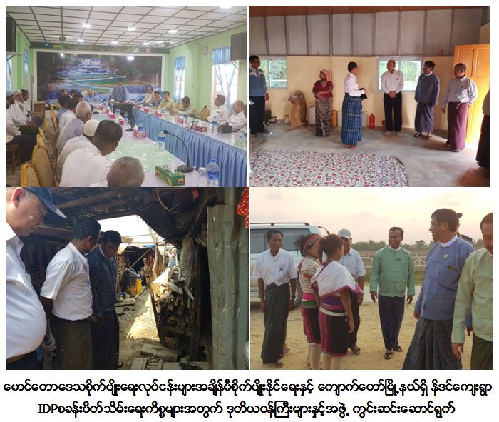 (၅-၄-၂၀၁၈)ရက်နေ့တွင် ရခိုင်ပြည်နယ်ဆိုင်ရာအကြံပြုချက်များအပေါ် အကောင်အထည်ဖော်ဆောင်ရွက်ရေးကော်မတီတွဲဖက်အတွင်းရေးမှူး၊ လူမှုဝန်ထမ်း၊ ကယ်ဆယ်ရေးနှင့်ပြန်လည်နေရာချထားရေးဝန်ကြီးဌာန၊ ဒုတိယဝန်ကြီးဦးစိုးအောင်နှင့် နိုင်ငံတောာ် အတိုင်ပင်ခံရုံးဝန်ကြီးဌာန၊ ဒုတိယဝန်ကြီးဦးကျော်တင်တို့သည် ရခိုင်ပြည်နယ်လုံခြုံရေးနှင့် နယ်စပ် ရေးရာဝန်ကြီးဗိုလ်မှူးကြီးဖုန်းတင့်နှင့် တာဝန်ရှိသူများလိုက်ပါလျက် (၅-၄-၂၀၁၈)ရက်နေ့နေ့လည်ပိုင်းတွင် ကျောက်တော်မြို့နယ် နိဒင်ကျေးရွာ IDP စခန်းသို့ ရောက်ရှိပြီးစခန်းစီမံခန့်ခွဲမှုကော်မတီဝင်များ၊ နိဒင်ကျေးရွာတာဝန်ခံများ၊ စခန်းတွင် နေထိုင်သူများနှင့်တွေ့ဆုံပြီးIDP စခန်းအားဖျက်သိမ်းပြီးကျေးရွာနှင့်တစ်ဆက်စပ်တည်း ပြန်လည်နေရာချထားရေးအစီအစဉ်များ၊အခြေခံပညာကျောင်းများတွင် ဆရာ/ဆရာမများခန့်ထားပေးရေး၊ အခြေခံပညာအထက်တန်းအောင်မြင်ပြီးသူများအဆင့်မြင့်ပညာများဆက်လက်သင်ကြားနိုင်ရေး၊ ကျောက်တော်မြို့နယ်၊ ခေါင်းတုတ်ရွာတွင် တိုက်နယ်ဆေးရုံတစ်ခုချထားပေးရေး၊ အသက်မွေးဝမ်းကြောင်းသင်တန်းများဖွင့်လှစ်ပေးရေးကိစ္စရပ်များနှင့် NVC လျှောက်ထားကိုင်ဆောင်ရေးကိစ္စရပ်များအားရှင်းလင်းပြောကြားဆွေးနွေးခဲ့ပါသည်။