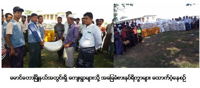 ဘေးအန္တရာယ်ဆိုင်ရာစီမံခန့်မှူဦးစီးဌာန၊ မောင်တောခရိုင်ဦးစီးမှူးရုံးမှ တာဝန်ရှိသူများသည် (၈-၄-၂၀၁၈) ရက်နေ့တွင် UEHRD စေနာ့ဝန်ထမ်းလူငယ်အစီအစဉ် (၅) ကြိမ်မြောက်နှင့် (၆) ကြိမ်မြောက်အကြား လူသားချင်းစာနာထောက်ထားမှုအကူအညီများ အဆက်မပြတ်စေရေးအတွက် မောင်တောမြို့နယ် မင်္ဂလာကြီးကျေးရွာအုပ်စု၊ သာဇေကျေးရွာနှင့် မီးကျောင်းတက်ကျေးရွာ၊ ရွာပေါင်း (၂) ရွာမှ အိမ်ထောင်စု (၂၃၂) စု၊ လူဦးရေ (၁၄၉၃) ဦးအား ဆန် (၄၆၆) အိတ်၊ (၁၃) ပြည်၊ (၄) ဘူး၊ ဆီ (၅၅၉.၈၇၅) ပိဿာ၊ ပဲ (၂၂၃၉.၅) ပိဿာ၊ ဆား (၁၁၁.၉၇၅) ပိဿာအား သွားရောက်ထောက်ပံ့ပေးခဲ့ကြောင်း သတင်းရရှိပါသည်။