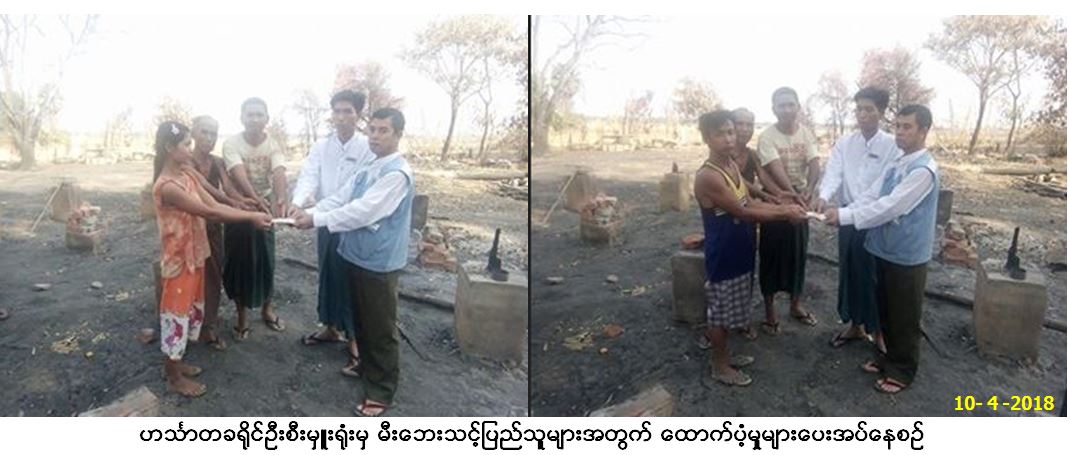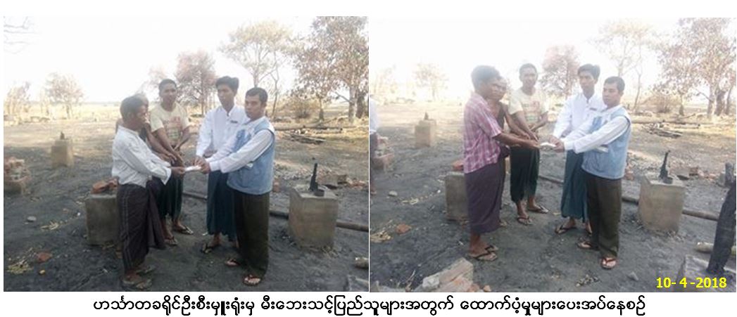 ဘေးအန္တရာယ်ဆိုင်ရာစီမံခန့်ခွဲမှုဦးစီးဌာန၊ ဟင်္သာတခရိုင်ဦးမှူးရုံးမှ တာဝန်ရှိသူများသည် အင်္ဂပူမြို့နယ်၊ ညောင်ကျိုးကျေးရွာအုပ်စု၊ ညောင်တုန်းလဲကျေးရွာ၌ (၄-၄-၂၀၁၈) ရက်နေ့တွင် ဖြစ်ပွားသောမီးဘေးကြောင့် ဘေးသင့်ခဲ့သည့် အိမ်ခြေ (၅)လုံး၊ အိမ်ထောင်စု (၅)စု၊ လူဦးရေ (၂၇)ဦးတို့အတွက် အိမ်ဆောက်ပစ္စည်းဖိုး (၈)သိန်း၊ ဆန်ရိက္ခာဖိုး (၅၆၇၀၀/-)ကျပ်၊ စုစုပေါင်းကယ်ဆယ်ရေးရန်ပုံငွေ (၈၅၆၇၀၀/-)ကျပ်တို့ိုအား (၁၀-၄-၂၀၁၈)ရက်နေ့တွင် ဘေးဖြစ်ပွားခဲ့သည့်နေရာသို့သွားရောက်ကာ ဘေးသင့်ပြည်သူများ၏ လက်ဝယ်သို့ ပေးအပ်ခဲ့ကြောင်း သတင်းရရှိပါသည်။