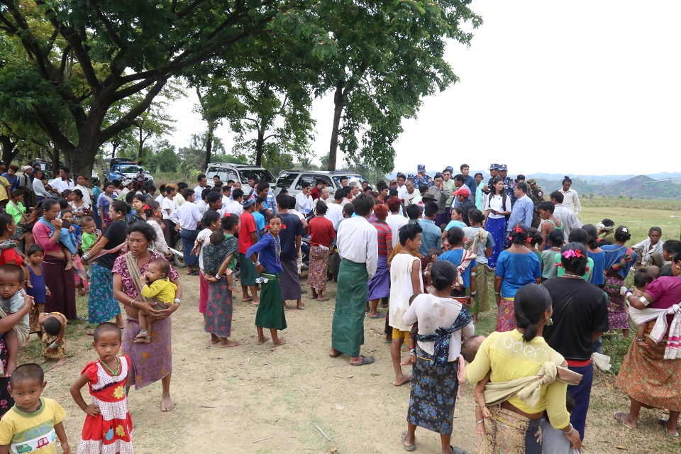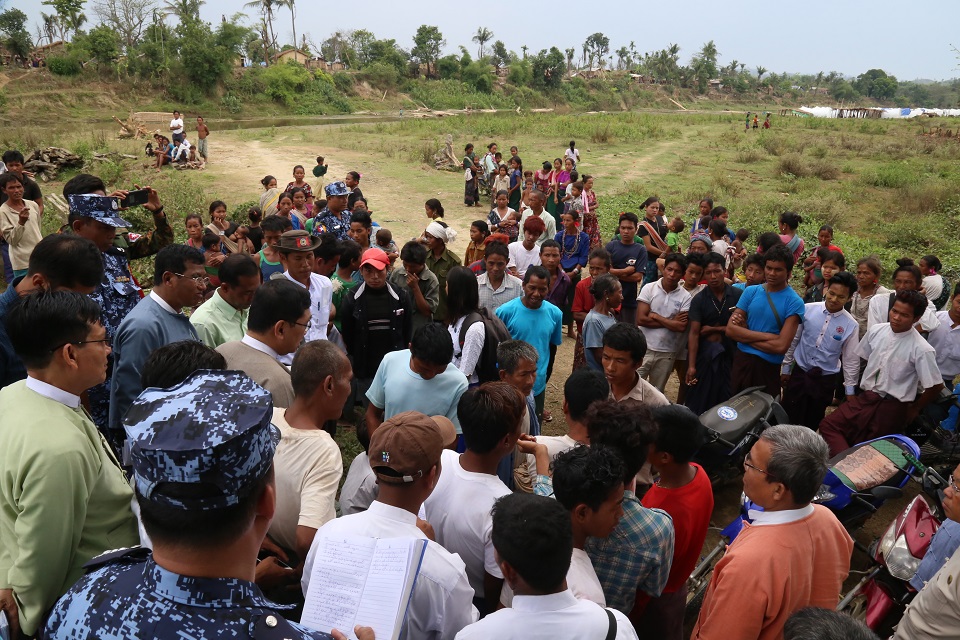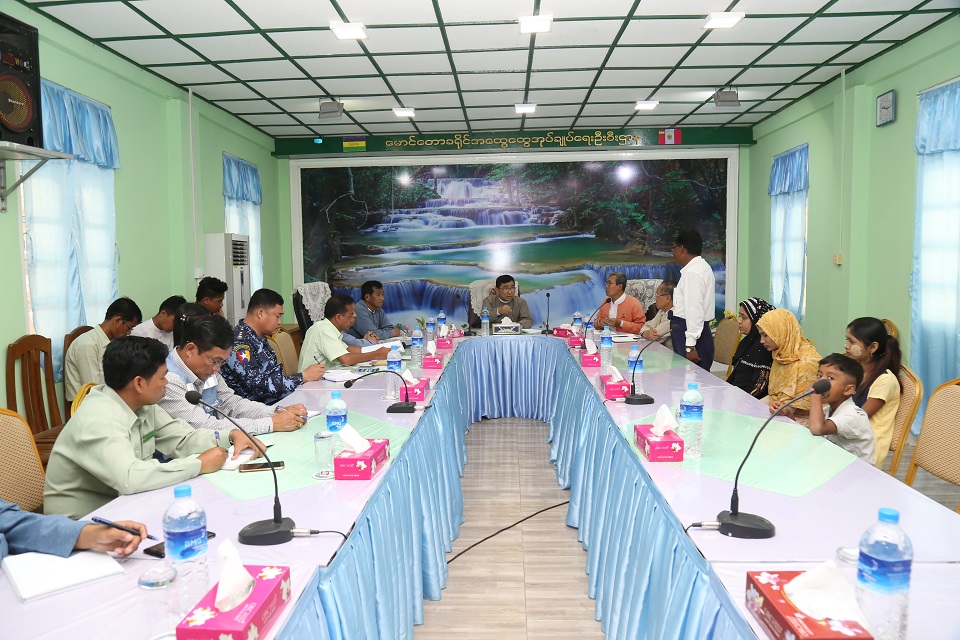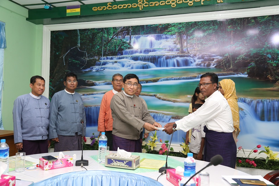 ဆက်လက်၍ မောင်တောခရိုင် အထွေထွေအုပ်ချုပ်ရေးဦးစီးဌာန ရုံးခန်းမ၌ မောင်တောဒေသအကြမ်းဖက်မှုဖြစ်စဉ်ကြောင့် နေရပ်စွန့်ခွာသွားကြသူများအနက် နှစ်နိုင်ငံနယ်နိမိတ်မျဉ်းအနီး ရောက်ရှိနေထိုင်ခဲ့သော အစ္စလာမ်ဘာသာဝင် အက်ဖ်တာအာလွမ်ပါမိသားစု (၅) ဦးနှင့်တွေ့ဆုံခဲ့ပြီး ပြန်လည်ဝင်ရောက်လာမှု အခြေအနေနှင့်အတွေ့အကြုံများ၊ အခက်အခဲများအား မေးမြန်းပြီး ထောက်ပံ့ငွေများ ပေးအပ်ခဲ့ပါသည်။ ထို့နောက် ပြည်ထောင်စုဝန်ကြီးနှင့်အဖွဲ့သည် မောင်တောခရိုင် ရခိုင်ရိုးရာရေကစားမဏ္ဍပ်သို့ ရောက်ရှိပြီး ပြည်သူများနှင့်အတူ ပျော်ရွှင်စွာ ပါဝင် ဆင်နွှဲခဲ့ပါသည်။