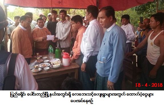 ပြည်ခရိုင်၊ ပေါင်းတည်မြို့နယ်၊ ကျေးရွာအုပ်စု (၄)စု၊ ကျေးရွာ (၁၄)ရွာ၌ (၁၆-၄-၂၀၁၈) ရက်နေ့တွင် လေဘေးကြောင့် ပြိုလဲနေအိမ် (၃၄)လုံးအတွက် တစ်အိမ်လျှင် (၁၀၀,၀၀၀ိ/-)ကျပ်နှုန်းဖြင့် (၃,၄၀၀,၀၀၀ိ/-) ကျပ်၊ လူဦးရေ (၁၂၂)ဦးအတွက် ဆန်ရိက္ခာဖိုးငွေ (၂၅၆,၂၀၀ိ/-)ကျပ်၊ ကယ်ဆယ်ရေးပစ္စည်း (၁၄)မျိုး (၃၄) ပုံး၊ နေအိမ်ပြိုလဲမှုကြောင့် သေဆုံးသူ (၁)ဦးအတွက် ထောက်ပံ့ငွေ (၃၀၀,၀၀၀ိ/-)ကျပ်၊ ဒဏ်ရာရသူ (၁)ဦး အတွက် ထောက်ပံ့ငွေ (၅၀,၀၀၀ိ/-) ကျပ်၊ အမိုးလန်နေအိမ် (၄၉၉) လုံးနှင့် အမိုးလန် ဘုန်းတော်ကြီးကျောင်း (၄) ကျောင်းတို့အတွက် အိမ်/ကျောင်းဆောက်ပစ္စည်းဖိုး တန်ဖိုးသင့်နှုန်းထားများဖြင့် (၂၇,၆၅၃,၀၀၀ိ/-) ကျပ်၊ စုစုပေါင်း ထောက်ပံ့ငွေ (၃၁,၆၅၉,၂၀၀ိ/-) ကျပ်တို့အား (၁၈-၄-၂၀၁၈) ရက်နေ့တွင် ပဲခူးတိုင်းဒေသကြီး ဝန်ကြီးချုပ်၊ ပဲခူးတိုင်းအစိုးရရုံးမှ အတွင်းရေးမှူးနှင့် တာဝန်ရှိသူများ၊ ပဲခူးတိုင်းဒေသကြီးဦးစီးမှူး(ဘစမ)၊ ပြည်ခရိုင်ဦးစီးမှူးရုံး၊ သာယာဝတီခရိုင်အုပ်ချုပ်ရေးမှူးနှင့် လွှတ်တော်ကိုယ်စားလှယ်များ၊ ပြည်ခရိုင်အုပ်ချုပ် ရေးမှူး၊ ပြည်ခရိုင် ဒုတိယရဲမှူးကြီး၊ ပေါင်းတည်မြို့နယ်အုပ်ချုပ်ရေးမှူးတို့မှ ဘေးသင့်နယ်မြေအရောက် ဘေးသင့်ပြည်သူများလက်ဝယ်အရောက် ထောက်ပံ့ပေးအပ်ခဲ့ကြောင်း သတင်းရရှိပါသည်။