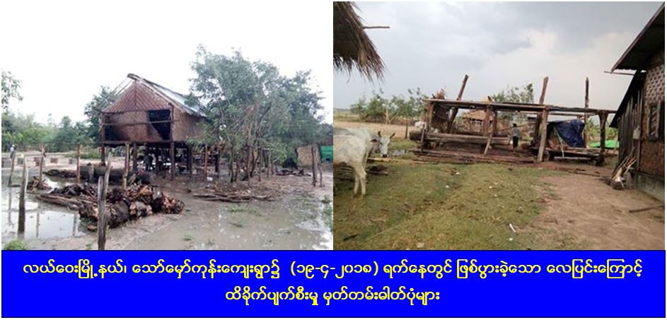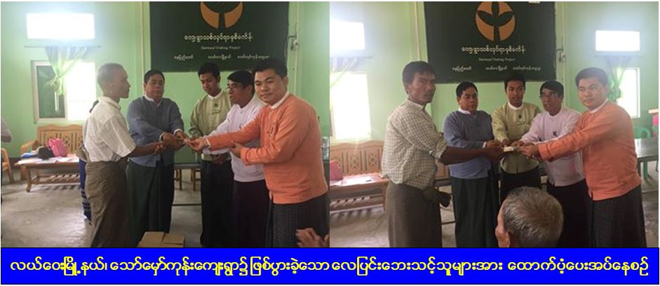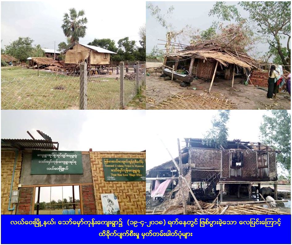 လယ်ဝေးမြို့နယ်၊ သော်မှော်ကုန်းကျေးရွာ၌ (၁၉-၄-၂၀၁၈) ရက်နေ့တွင် ဖြစ်ပွားခဲ့သော လေပြင်းဘေးကြောင့် ထိခိုက်ခံရသူများအား နေပြည်တော်ကောင်စီဝင် ဦးအေးမောင်စိန်၊ လွှတ်တော်ကိုယ်စားလှယ် ဦးမျိုးဇော်ဦး၊ နေပြည်တော်တိုင်းဦးစီးမှူး ဦးကျော်ကျော်ထွန်းနှင့် လယ်ဝေးမြို့နယ် အထွေထွေအုပ်ချုပ်ရေးမှူး ဦးမျိုးကျော်ကျော်တို့မှ လေဘေးသင့်ပြည်သူများထံသွားရောက်၍ ပြိုလဲအိမ် (၄)လုံးအတွက် အိမ်ဆောက်ပစ္စည်းဖိုး ငွေ (၄၀၀,၀၀၀/-)ကျပ်၊ အိမ်အမိုးလန်(၃၀)လုံးအတွက် အိမ်ဆောက်ပစ္စည်းဖိုးငွေ (၅၇၅,၀၀၀/-)ကျပ်၊ လေဘေးသင့်သူ (၁၃၉)ဦးအတွက် ဆန်ရိက္ခာဖိုး ထောက်ပံ့ငွေ(၂၉၁,၉၀၀/-)ကျပ်၊ စုစုပေါင်းထောက်ပံ့ငွေ (၁,၂၆၆,၉၀၀/-)ကျပ်နှင့် ကယ်ဆယ်ရေးပစ္စည်း များအား ဘေးသင့်ပြည်သူများလက်ဝယ်သို့ (၂၀-၄-၂၀၁၈)ရက်နေ့(၁၃:၀၀)နာရီအချိန်တွင် သွားရောက် ကွင်းဆင်းထောက်ပံ့ခဲ့ကြောင်း သတင်းရရှိပါသည်။