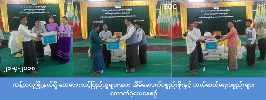 ကန့်ဘလူမြို့နယ်အတွင်း ကျေးရွာ(၂၆)ရွာ၌ (၁၈-၄-၂၀၁၈)ရက်နေ့တွင် ဖြစ်ပွားခဲ့သော လေဘေးကြောင့် အမိုးလန်အိမ်ခြေ (၁၄၁) အိမ်၊ ပြိုကျအိမ် (၁) လုံး စုစုပေါင်း (၁၄၂)အိမ် ဘေးသင့်ခဲ့ရာ အမိုးလန်အိမ် (၁၄၁) အိမ်အတွက် ကယ်ဆယ်ရေးပစ္စည်း(၅)မျိုး၊ပြိုကျ (၁) အိမ်အတွက် ကယ်ဆယ်ရေးပစ္စည်း (၁၀) မျိုး၊ စုစုပေါင်း အိမ်ဆောက်ပစ္စည်း ထောက်ပံ့ငွေ (၄,၄၇၀,၀၀၀) ကျပ်တို့ကို ထောက်ပံ့ပေးအပ်ခဲ့ကြောင့် သိရှိရ ပါသည်။