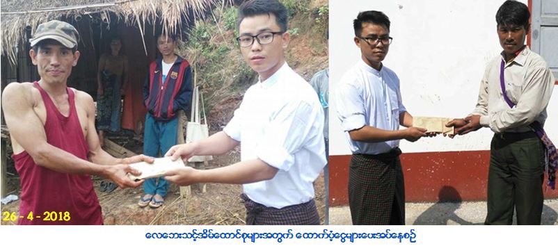 ဘေးအန္တရာယ်ဆိုင်ရာစီမံခန့်ခွဲမှုဦးစီးဌာန၊ မိုင်းဖြတ်မြို့နယ်ဦးစီးမှူးရုံးမှ တာဝန်ရှိသူများသည် မိုင်းဖြတ်မြို့နယ် အတွင်းရှိ နမ့်ယွန်းကျေးရွာ၊ ပါဆန်းကျေးရွာ၊ နမ့်ကုန်းကျေးရွာနှင့် ဟကြာမုဒိကျေးရွာတို့၌ (၂၄-၄-၂၀၁၈) ရက်နေ့တွင် ဖြစ်ပွားခဲ့သော လေဘေးကြောင့် ဘေးသင့်ခဲ့သော အိမ်ထောင်စု (၁၂)စု၊ ဘုန်းကြီးကျောင်း (၂) ကျောင်းနှင့် ကိုယ့်အားကိုယ်ကိုး အ.မ.က ကျောင်း (၁) ကျောင်းတို့အတွက် စုစုပေါင်း ထောက်ပံ့ငွေ (၈၈၈,၀၀၀ိ/-) ကျပ်တို့အား (၂၆-၄-၂၀၁၈) ရက်နေ့တွင် သွားရောက်ထောက်ပံ့ပေးအပ်ခဲ့ကြောင်း သတင်း ရရှိပါသည်။