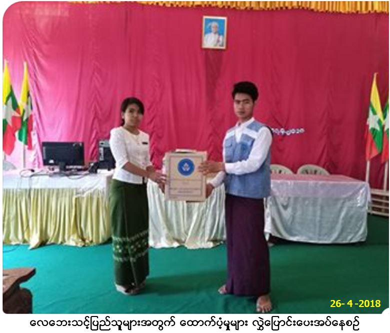 ဘေးအန္တရာယ်ဆိုင်ရာစီမံခန့်ခွဲမှုဦးစီးဌာန၊ သရက်ခရိုင်ဦးစီးမှူးရုံးမှ တာဝန်ရှိသူများသည် (၂၅.၄.၂၀၁၈ )ရက်နေ့၊ (၁၅း၁၀)နာရီမှ (၁၅း၂၅) နာရီအချိန်ထိ လေပြင်းတိုက်ခတ်မှုကြောင့် ကံမမြို့နယ်၊ အလယ်ချောင်း ကျေးရွာအုပ်စု၊ အလယ်ချောင်းကျေးရွာတွင် အိမ်ခြေ(၃)လုံး၊ အိမ်ထောင်စု(၃)စု၊ လူဦးရေ(၈)ဦး ဘေးသင့်ခဲ့ပြီး ဘေးသင့်လူဦးရေ(၈)ဦးအတွက် ဆန်ရိက္ခာဖိုး(၇)ရက်စာ ၁၆၈၀၀ိ/-၊ အမိုးလန်နေအိမ်(၃)လုံးအတွက် အိမ်ဆောက်ပစ္စည်းဖိုး ၁၃၀၀၀၀ိ/-၊ ရန်ပုံငွေစုစုပေါင်း ၁၄၆၈၀၀ိ/- နှင့် ကယ်ဆယ်ရေးပစ္စည်း(၆)မျိုး (၃)အိမ်ထောင်စာတို့ကို (၂၆.၄.၂၀၁၈)ရက်နေ့တွင် ကံမမြို့နယ် အထွေထွေအုပ်ချုပ်ရေးဦးစီးဌာနမှ တာဝန်ရှိသူများထံသို့ လွှဲပြောင်း ထောက်ပံ့ပေးအပ်ခဲ့ကြောင်း သတင်းရရှိပါသည်။
