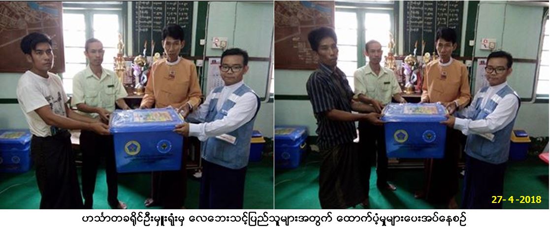 ဘေးအန္တရာယ်ဆိုင်ရာစီမံခန့်ခွဲမှုဦးစီးဌာန၊ ဟင်္သာတခရိုင်ဦးစီးမှူးရုံးမှ တာဝန်ရှိသူများသည် ဟင်္သာတမြို့နယ်အတွင်းရှိ ကျေးရွာအုပ်စ ု(၅)စုမှ ကျေးရွာခွဲ (၂၁)ရွာ၌ (၂၄-၄-၂၀၁၈) ရက်နေ့တွင် ဖြစ်ပွားခဲ့သော လေဘေးကြောင့် ပြိုကျပျက်စီးနေအိမ် (၁၃)လုံး၊ အမိုးလန် (၁၁၄)လုံး၊ စုစုပေါင်း (၁၂၇)လုံး၊ လူဦးရေ (၆၄၁)ဦးတို့အတွက် (၂,၅၉၅,၇၂၉ိ/-) ကျပ် တန်ဖိုးရှိ ကယ်ဆယ်ရေးပစ္စည်း (၁၀)မျိုး (၁၁၄)အိမ်ထောင်စာ၊ ကယ်ဆယ်ရေးပစ္စည်း (၁၆)မျိုး (၁၃) အိမ်ထောင်စာတို့အား (၂၇-၄-၂၀၁၈) ရက်နေ့တွင် ဟင်္သာတမြို့နယ်၊ အထွေထွေအုပ်ချုပ်ရေးဦးစီးဌာန၊ အစည်းအဝေးခန်းမ၌ တာဝန်ရှိသူများနှင့်အတူ ဘေးသင့်ပြည်သူများလက်ဝယ်သို့ (ကနဦး) ထောက်ပံ့ပေးအပ်ခဲ့ကြောင်း သတင်းရရှိပါသည်။